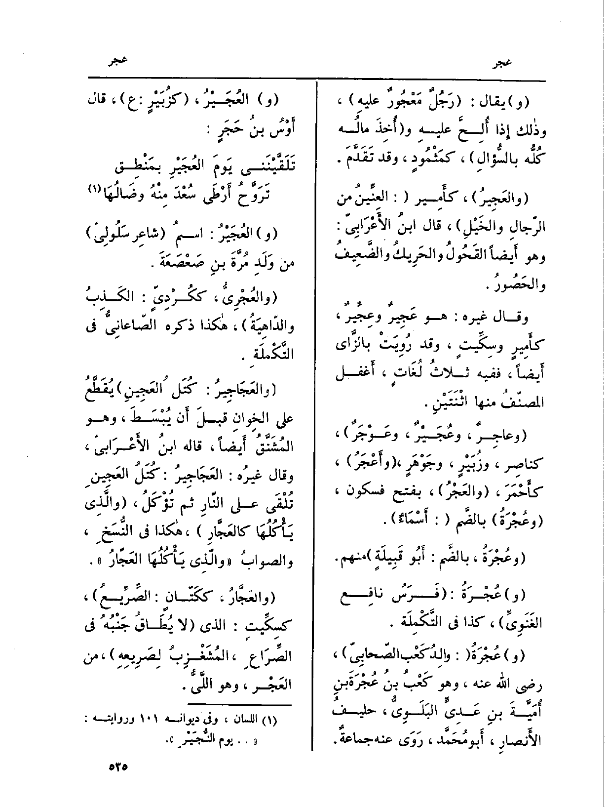 (و) العُجَيْرُ: اسمُ (شاعِر سَلُولِيّ) من وَلَدِ مُرَّةَ بنِ صَعْصَعَةَ.