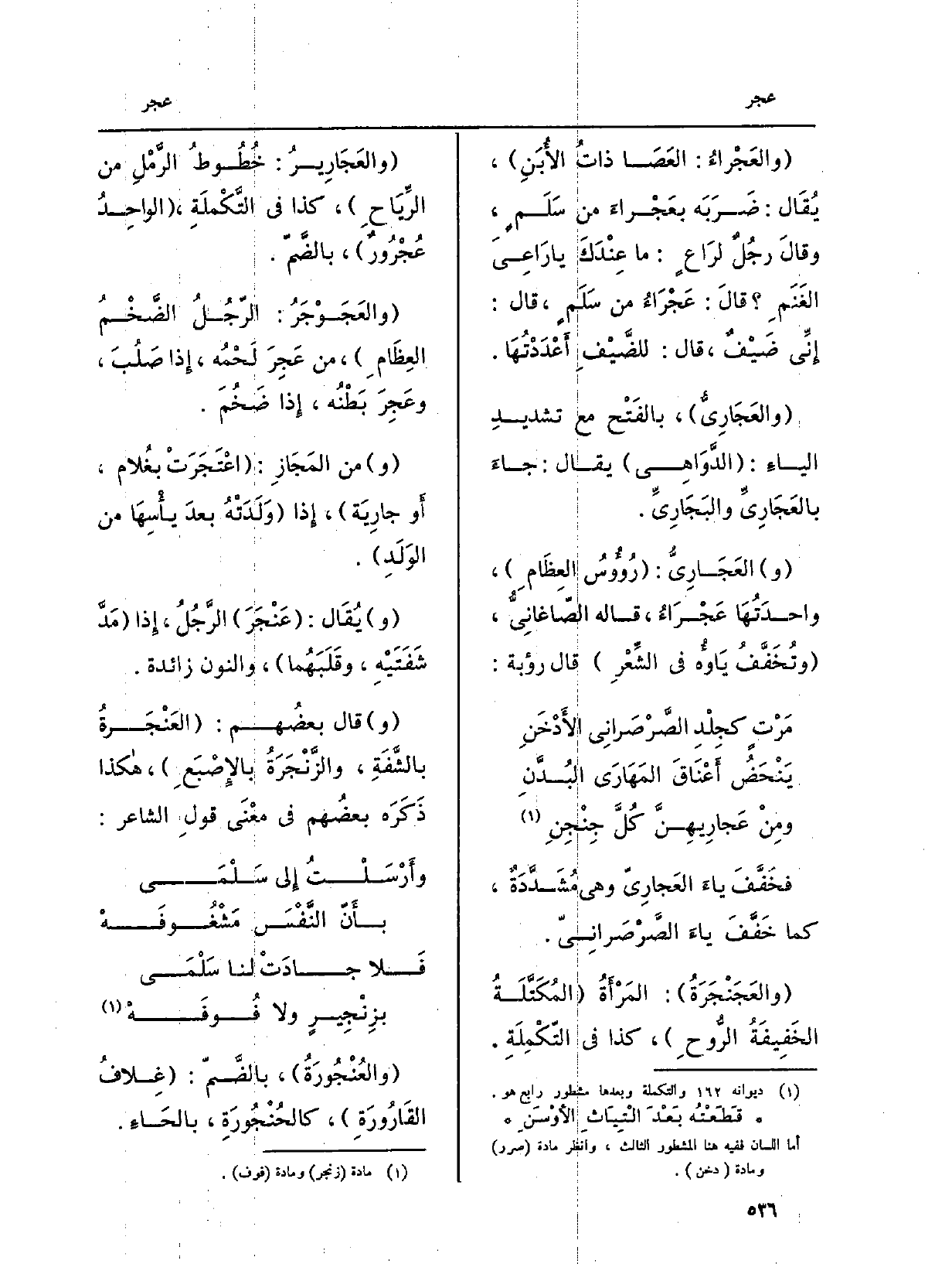 (و) العَجَارِيُّ: (رُؤُوسُ العِظَامِ) ، واحدَتُهَا عَجْرَاءُ، قَالَه الصّاغانِيُّ، (وتُخَفَّفُ ياؤُه فِي الشِّعْرِ) قَالَ رؤبة: