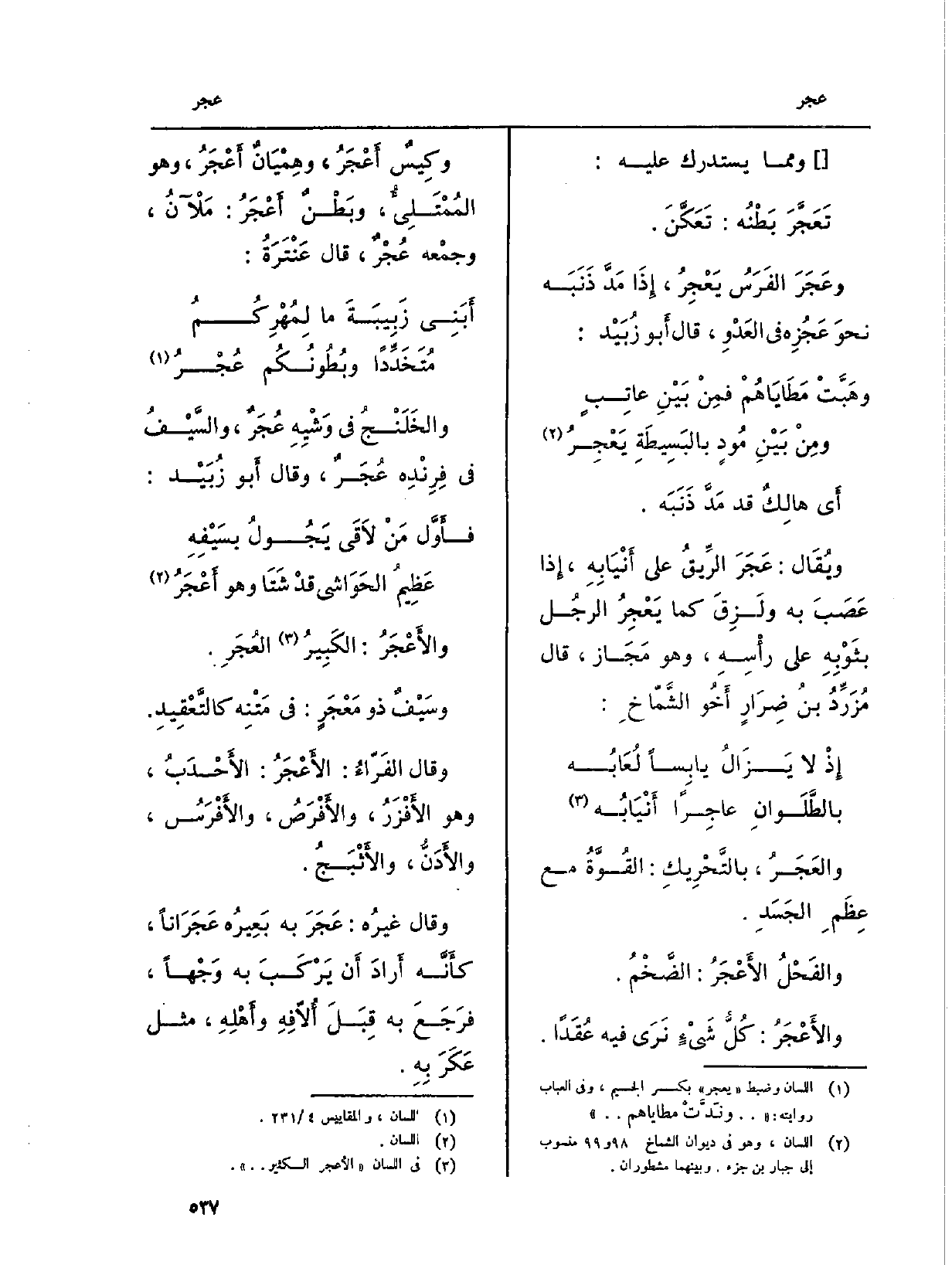 وكِيسٌ أَعْجَرُ، وهِمْيَانٌ أَعْجَرُ، وَهُوَ المُمْتَلِىءُ، وبَطْنٌ أَعْجَرُ، مَلآنُ، وجمْعه عُجْرٌ، قَالَ عَنْتَرَةُ: