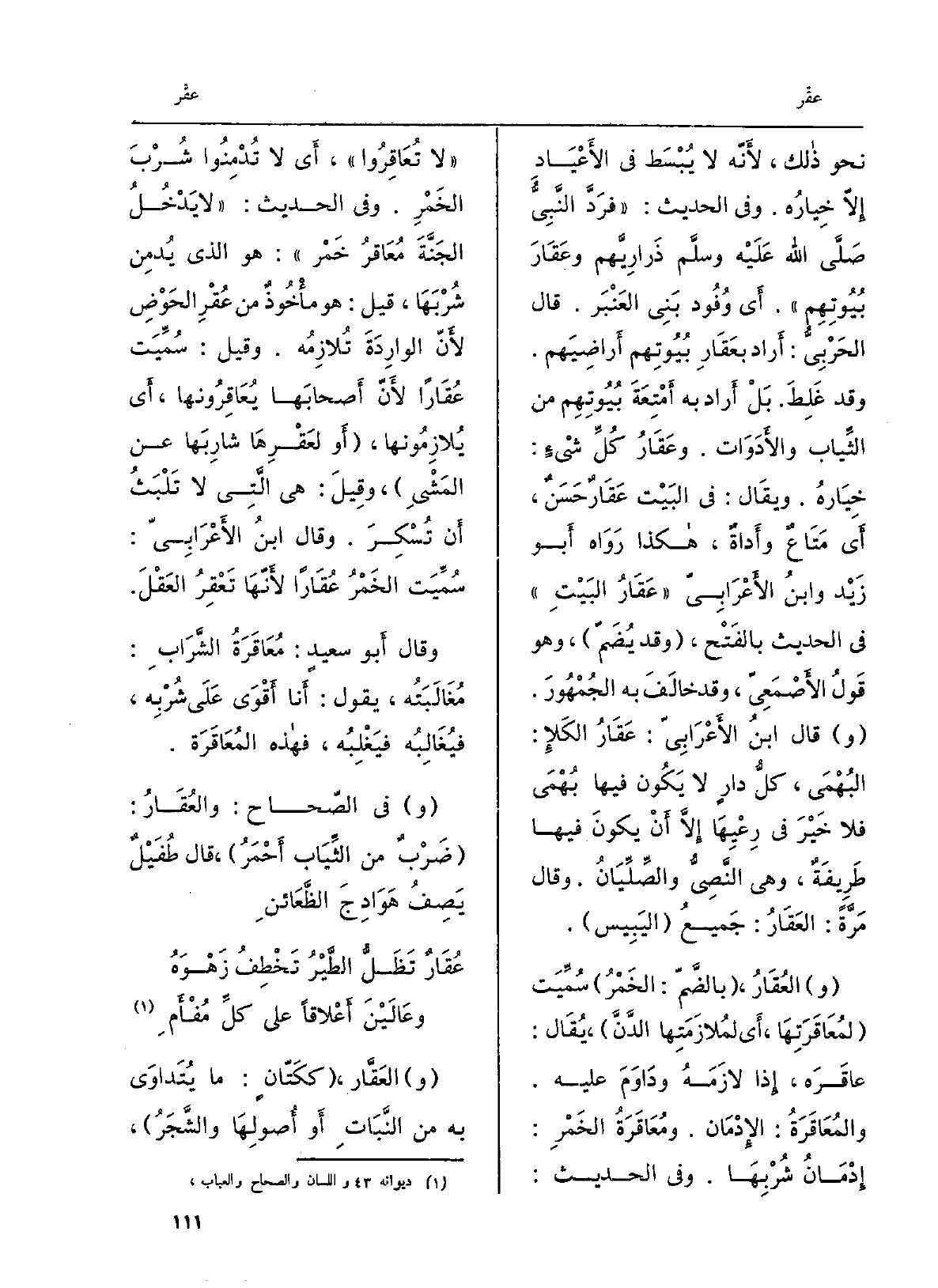 نَحْو ذَلِك، لأَنّه لَا يُبْسَط فِي الأَعْيَادِ إِلاّ خِيارُه. وَفِي الحَدِيث: فرَدَّ النَّبِيُّ صلَّى الله عَلَيْه وسلَّم ذَرارِيَّهم وعَقَارَ بُيُوتِهِم. أَي وُفُود بَنِي العَنْبَر. قَالَ الحَرْبِيُّ: أَراد بعَقَارِ بُيُوتِهم أَراضيَهم. وَقد غَلِطَ. بَلْ أَرَادَ بِهِ أَمْتِعَةَ بُيُوتِهِم من الثِّياب والأَدَوَات. وعَقَارُ كُلِّ شيْءٍ: خِيَارهُ. ويقَال: فِي البَيْت عَقَارٌ حَسَنٌ، أَي مَتَاعٌ وأَداةٌ، هَكَذَا رَوَاه أَبو زَيْد وابنُ الأَعْرَابِيّ عَقَارُ البَيْتِ فِي الحَدِيث بالفَتْح، وَقد يُضَمّ، وَهُوَ قَوْلُ الأَصْمَعِيّ، وَقد خالَفَ بِهِ الجُمْهُورَ. وَقَالَ ابنُ الأَعْرَابِيّ: عَقَارُ الكَلإِ: البُهْمَي، كلُّ دارٍ لَا يَكُون فِيهَا بُهْمَى فَلَا خَيْرَ فِي رِعْيِهَا إِلاَّ أَنْ يكونَ فِيهَا طَرِيفَةٌ، وَهِي النَّصِىُّ والصِّلِّيَانُ. وَقَالَ مَرَّةً: العَقَارُ: جَميعُ اليَبِيس. والعُقَارُ، بالضَّمّ: الخَمْرُ سُمِّيَت لمُعَاقَرَتِهَا، أَي لمُلاَزَمَتِها الدَّنَّ، يُقَال: عاقَرَه، إِذا لازَمَهُ ودَاوَمَ عَلَيْهِ. والمُعَاقَرَةُ: الإِدْمَان. ومُعَاقَرَةُ الخَمْرِ: إِدمَانُ شُرْبِهَا. وَفِي الحَدِيث: لَا تُعَاقِرُوا، أَي لَا تُدْمِنُوا شُرْبَ الخَمْرِ.