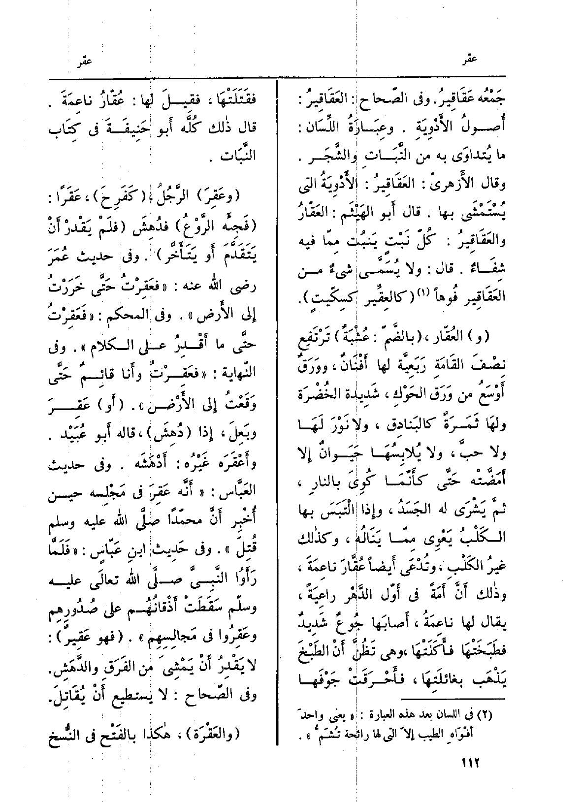 قَالَ ذَلِك كُلَّه أَبو حَنِيفَةَ فِي كِتَاب النَّبَات. وعَقِرَ الرَّجُلُ، كَفَرِحَ، عَقَراً: فَجِئَه الرَّوْعُ فدُهِشَ فلَمْ يَقْدرْ أَنْ يَتَقَدَّمَ أَو يَتَأَخَّر. وَفِي حَدِيث عُمَر رَضِي الله عَنهُ: فعَقِرْتُ حَتَّى خَرَرْتُ إِلى الأَرض.