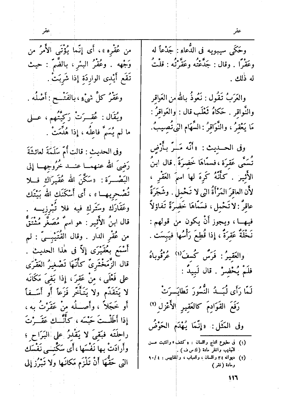 وحَكَى سِيبَوَيْهٍ فِي الدُّعاءِ: جَدْعاً لَهُ وعَقْراً. وَقَالَ: جَدَّعْتُه وعَقَّرْتُه: قلْتُ لَهُ ذَلِك. والعَرَبُ تَقُول: نَعُوذُ بِاللَّه من العَواقِر والنَّواقِر. حَكاهُ ثَعْلَب قَالَ: والعَواقِرُ: مَا يَعْقِرُ، والنَّوَاقِرُ: السِّهَام الَّتِي تُصِيبُ. وَفِي الحَدِيث: أَنّه مَر بأَرْضٍ تُسَمَّى عَقِرَة، فسمّاهَا خَضِرَةً. قَالَ ابنُ الأَثِير. كأَنّهُ كَرِهَ لَهَا اسمَ العَقْرِ، لأَن العاقِرَ المَرْأَةُ الَّتِي لَا تَحْمِل. وشَجَرَةٌ عاقِرٌ: لَا تَحْمِل، فسَمّاهَا خَضِرَةً تفاؤلاً فِيهَا، وَيجوز أَنْ يكون من قَوْلهم: نَخْلَةٌ عَقِرَةٌ، إِذا قُطِعَ رَأْسُها فيَبِسَت. والعَقِيرُ: فَرَسٌ كُسِفَ عُرْقُوباهُ فلَمْ يُحْضِرْ. قَالَ لَبِيدٌ: