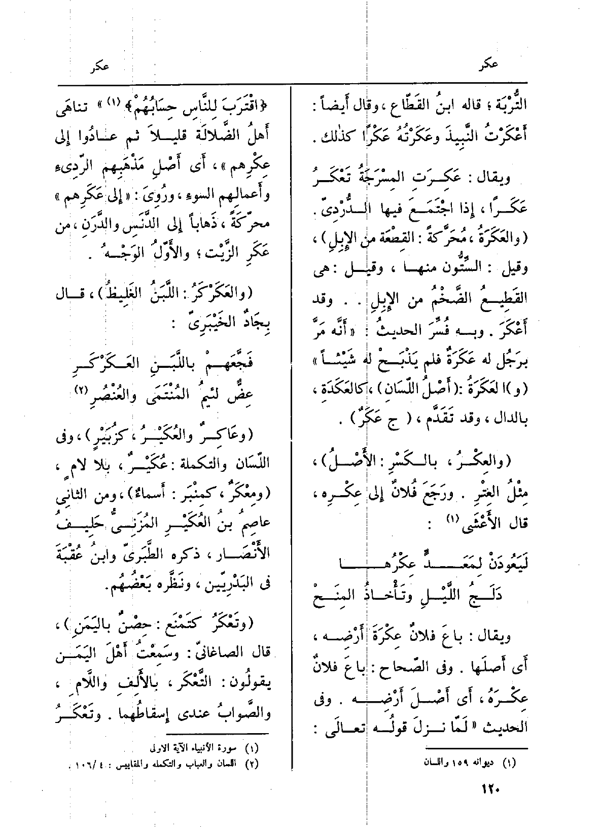 وَفِي الحَدِيث لَمّا نزلَ قولُه تعالَى: اقْتَرَبَ لِلنَّاسِ حِسَابُهُمْ تناهَى أَهلُ الضَّلالَة قَلِيلا ثمَّ عادُوا إِلى عِكْرِهم، أَي أَصْلِ مَذْهَبِهم الرّدِئِ وأَعمالِهم السوءِ، ورُوِىَ: إِلى عَكَرِهم محرّكَةً، ذَهاباً إِلى الدَّنَسِ والدَّرَنِ، من عَكَرِ الزَّيْت والأَوّلُ الوَجْهُ. والعَكَرْكَرُ: اللَّبَنُ الغَلِيظُ، قَالَ بِجَادٌ الخَيْبَرِيّ: