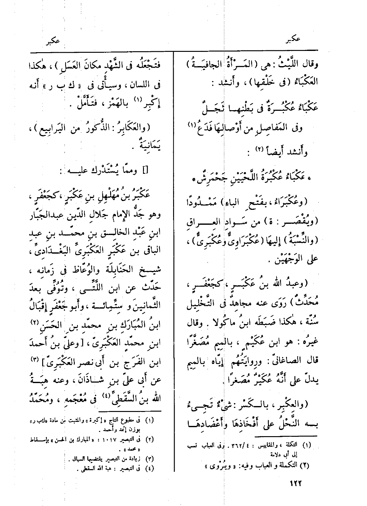 وأَنشد أَيضاً: عَكْبَاءُ عُكْبُرَةُ اللَّحْيَيْنِ جَحْمَرِشٌ. وعُكْبَرَاءُ، بفَتْحِ الباءِ مَمْدُوداً ويُقْصَر: ة من سَوادِ العِراقِ والنِّسْبَةُ إِليهَا عُكْبَرَاوِىٌّ وعُكْبِرَىٌّ، على الوَجْهَيْن. وعبدُ الله بنُ عَكْبَرٍ، كجَعْفَرٍ، مُحَدِّثٌ رَوَى عَنهُ مجاهِدٌ فِي التَّخْلِيل سُنّة، هَكَذَا ضَبَطَه ابنُ ماكُولا. وَقَالَ غيرُه: هُوَ ابْن عُكَيْمٍ، بالمِيم مُصَغَّراً قَالَ الصاغانيّ: ورِوايَتُهُم إِيّاه بالمِيم يدلّ على أَنَّهُ عُكَيْرٌ مُصَغراً. والعِكْبِر، بالكَسْر: شيْءٌ تَجِئُ بِهِ النَّحْلُ على أَفْخَاذِهَا وأَعْضَادِهَا فتَجْعَلُه فِي الشَّهْدِ مكانَ العَسَلِ، هَكَذَا فِي اللِّسَان، وسيأْتي فِي ك ب ر أَنه إِكْبِر بالهَمْز، فتَأَمَّلْ. والعَكَابِرُ: الذُّكورُ من اليَرابِيع، يَمَانِيَةٌ.