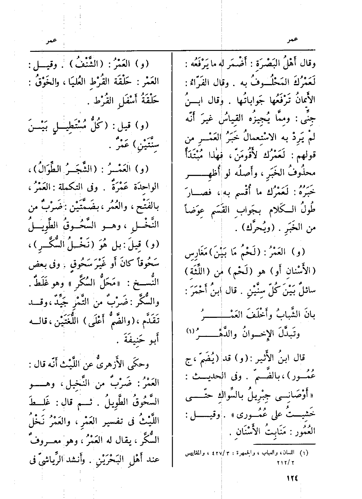 قَالَ ابنُ الأَثِير: وَقد يُضَمّ، ج عُمُور، بالضَّمّ. وَفِي الحَدِيث: أَوْصَانِي جِبْرِيلُ بالسِّواكِ حتّى خَشِيتُ على عُمُوري. وَقيل: العُمُور: مَنَابِتُ الأَسْنَانِ. والعَمْرُ: الشَّنْفُ. وَقيل: العَمْر: حَلْقَة القُرْطِ العُليَا، والخَوْقُ: حَلْقَةُ أَسْفَلِ القُرْط. وَقيل: كُلُّ مُسْتَطِيلٍ بَيْنَ سَنَّتَيْنِ عَمْرٌ. والعَمْرُ: الشَّجَرُ الطِّوَالُ، الواحِدَة عَمْرَةٌ. وَفِي التكملة: العَمْرُ، بالفَتْح، والعُمُر، بضَمَّتَيْن: ضَرْبٌ من النَّخْلِ، وَهُوَ السَّحُوقُ الطَّوِيلُ وقيلَ: بل هُوَ نَخْلُ السُّكَّرِ، سَحُوقاً كانَ أَو غَيْرَ سَحُوقٍ. وَفِي بعض النُّسخ: مَحَلُّ السُكَّرِ وَهُوَ غَلَطٌ. والسُّكَّر: ضَرْبٌ من التَّمْرِ جَيِّدٌ، وَقد تَقَدَّم، والضَّمُّ أَعْلَى اللُّغَتَيْن، قَالَه) أَبو حَنِيفَةَ. وحكَى الأَزْهَريُّ عَن اللَّيْث أَنّه قَالَ: العَمْرُ: ضَرْبٌ من النَّخِيل، وَهُوَ السَّحُوقُ الطَّوِيلُ. ثمَّ قَالَ: غَلِطَ اللَّيْثُ فِي تَفْسِير العَمْرِ، والعَمْرُ نَخْلُ السُّكَّر، يُقَال لَهُ العَمْرُِ، وَهُوَ معروفٌ عِنْد أَهْلِ البَحْرَيْنِ. وأَنشد الرِّياشيّ فِي