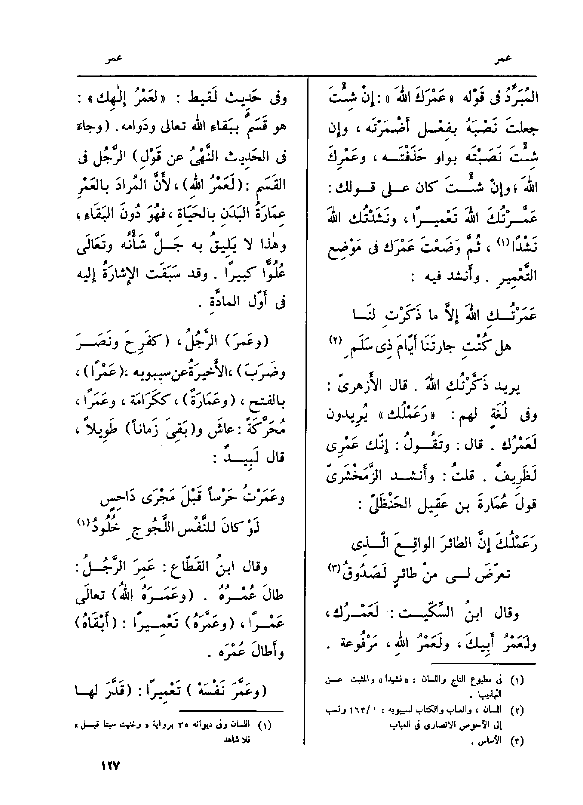 وَقَالَ ابنُ السِّكّيت: لَعَمْرُك ولَعَمْرُ أَبِيكَ، ولَعَمْرُ اللهِ، مَرْفُوعة. وَفِي حَدِيث لَقيط: لَعْمُر إِلهِك: هُوَ قَسَمٌ ببَقاءِ الله تَعَالَى ودَوامه. وجاءَ فِي الحَدِيثِ النَّهْىُ عَن قَوْلِ الرَّجُل فِي القَسَم: لَعَمْرُ اللهِ، لأَنَّ المُرادَ بالعَمْرِ عِمَارَةُ البَدَنِ بِالحَيَاةِ، فهُوَ دُونَ البَقَاءِ، وَهَذَا لَا يَلِيقُ بِهِ جَلَّ شَأْنُه وتَعَالَى عُلُوَّاً كَبِيرا. وَقد سَبَقت الإِشَارَةُ إِليه فِي أَوّل المادَّةِ. وعَمرَ الرَّجُلُ، كفَرِحَ ونَصَرَ وضَرَبَ، الأَخِيرَةُ عَن سِيبَوَيْهٍ، عَمْراً، بِالْفَتْح، وعَمَارَةً، ككَرَامَة، وعَمَراً، مُحَرَّكَةً: عاشَ وبَقِيَ زَماناً طَوِيلاً، قَالَ لَبِيدٌ: وعَمَرْتُ حَرْساً قَبْلَ مَجْرَى دَاحِسٍ لَوْ كانَ للنَّفْس اللَّجُوجِ خُلُودُ وَقَالَ ابنُ القَطّاع: عَمِرَ الرَّجُلُ: طالَ عُمْرُهُ. وعَمَرَهُ اللهُ تعالَى عَمْراً، وعَمَّرَهُ تَعْمِيراً: أَبْقَاهُ)