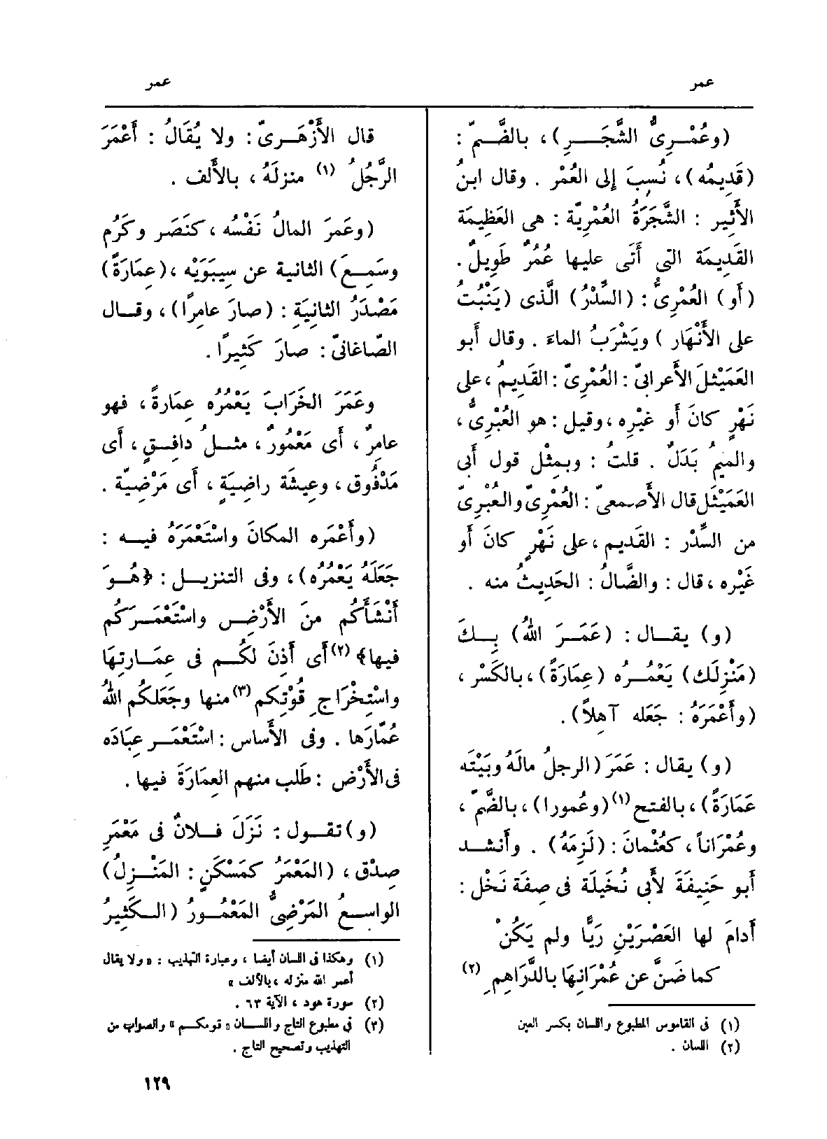 وعُمْرِيُّ الشَّجَرِ، بالضَّمّ: قَدِيمُه، نُسِبَ إِلى العُمْر. وَقَالَ ابنُ الأَثِير: الشَّجَرَةُ العُمْرِيّة: هِيَ العَظِيمَة القَدِيمَة الَّتِي أَتَى عَلَيْهَا عُمْرٌ طَوِيلٌ. أَو العُمْرِىُّ: السِّدْرُ الَّذي يَنْبُتُ على الأَنْهَار ويَشْرَبُ الماءَ. وَقَالَ أَبُو العَمَيْثلَ الأَعرابيّ العُمَرِىّ: القَدِيمُ، على نَهْرٍ كانَ أَو غيْرِه، وَقيل: هُوَ العُبْرِىُّ، والميمُ بَدَلٌ. قلتُ: وبمِثْل قَول أَبي العَمَيْثَل قَالَ الأَصْمَعِيّ: العُمْرِىّ والعُبْرِى من السِّدْر: القَديم، على نَهْرٍ كانَ أَو غَيْره، قَالَ: والضَّالُ: الحَدِيثُ مِنْهُ. وَيُقَال: عَمَرَ اللهُ بِكَ مَنْزِلَك يَعْمُرُه عِمَارَةً، بالكَسْر، وأَعْمَرَهُ: جَعَله آهِلاً. وَيُقَال: عَمَرَ الرجلُ مالَهُ وبَيْتَه عَمَارَةً، بِالْفَتْح وعُمورا، بالضَّمّ، وعُمْرَاناً، كعُثْمانَ: لَزِمَهُ. وأَنشد أَبو حَنِيفَةَ لأَبي نُخَيلَة فِي صِفَة نَخْل: