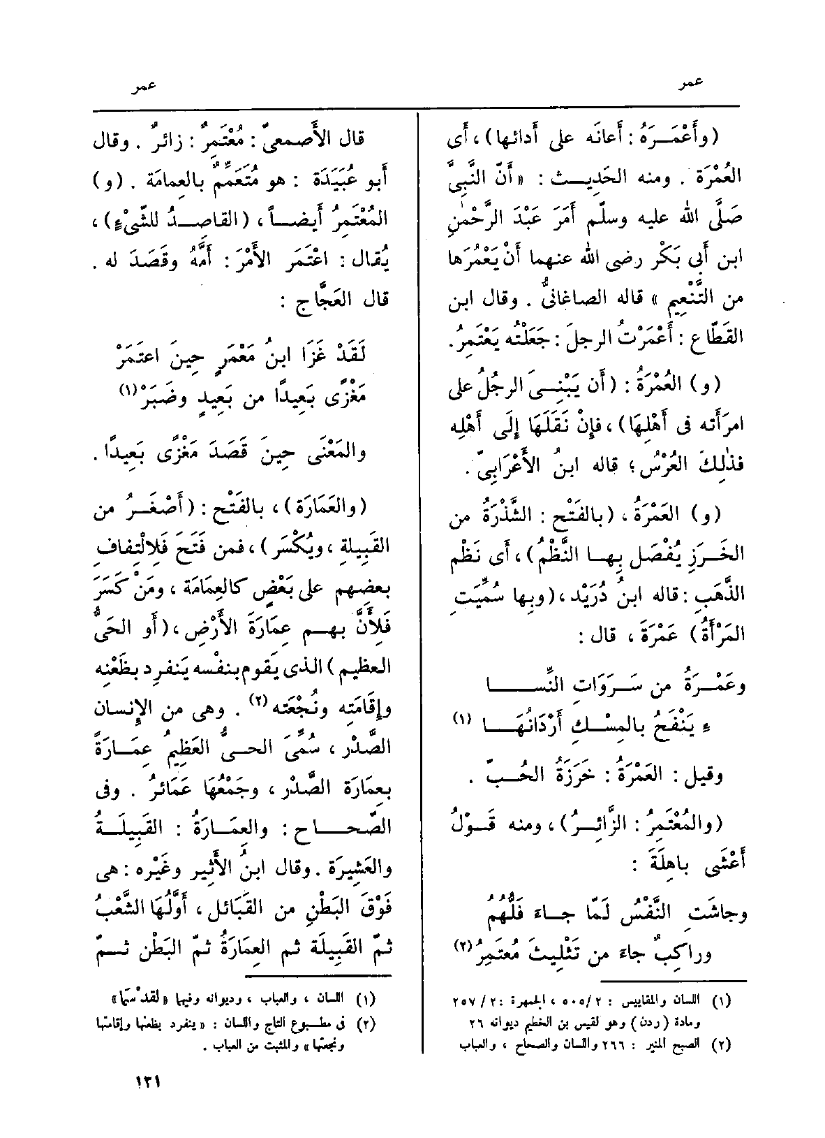 وأَعْمَرَهُ: أَعانَه على أَدائها، أَي العُمْرَة. وَمِنْه الحَدِيث: أَنّ النَّبِيَّ صَلَّى الله عَلَيْهِ وسلّم أَمَرَ عَبْدَ الرَّحْمنِ ابْن أَبي بَكْر رَضِي الله عَنْهُمَا أَنْ يَعْمُرَها من التَّنْعِيم قَالَه الصاغانيُّ. وَقَالَ ابْن القَطّاع: أَعْمَرْتُ الرجلَ: جَعَلْتُه يَعْتَمِرُ. والعُمْرَةُ: أَن يَبْنِيَ الرجُلُ على امرَأَته فِي أَهْلِهَا، فإِنْ نَقَلَهَا إِلى أَهْلِه فذلِكَ العُرْسُ قَالَ ابنُ الأَعْرَابِيّ. والعَمْرَةُ، بالفَتْح: الشَّذْرَةُ من الخَرَزِ يُفْصَل بِها النَّظْمُ، أَي نَظْم الذَّهَبِ: قَالَه ابنُ دُرَيْد، وبِها سُمِّيَتِ المَرْأَةُ عَمْرَةَ، قَالَ:)