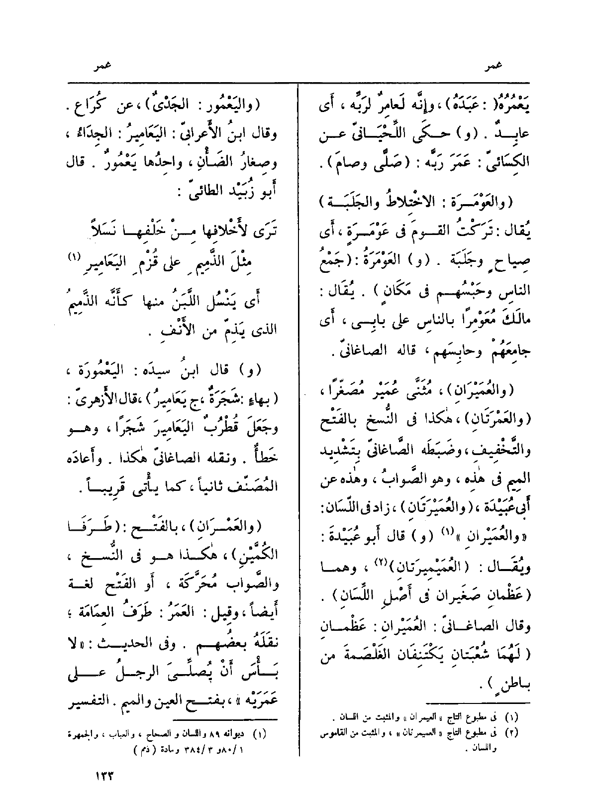 وأَعادَه المُصَنّف ثَانِيًا، كَمَا يأْتي قَرِيباً. والعَمْرَانِ، بالفضتْح: طَرَفَا الكُمَّيْنِ، هَكَذَا هُوَ فِي النُّسخ، والصَّواب مُحَرَّكَة، أَو الفَتْح لُغَة أَيضاً، وقِيل: العَمَرُ: طَرَفُ العِمَامَة نقَلَهُ بعضُهم. وَفِي الحَدِيث: لَا بَأْسَ أَنْ يُصلِّيَ الرجلُ على عَمَرَيْه، بِفَتْح الْعين وَالْمِيم. التَّفْسِير