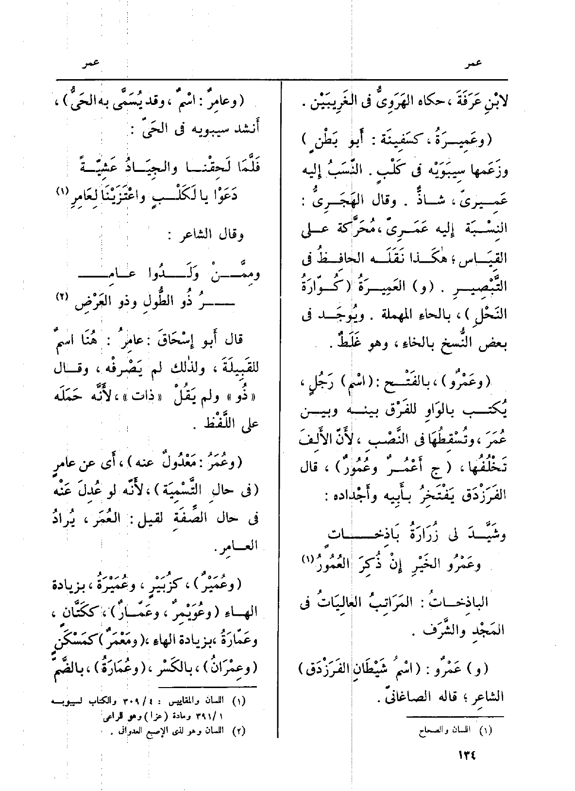 قَالَ أَبو إِسْحَاقَ: عامِرُ: هُنَا اسمٌ للقَبِيلَةَ، وَلذَلِك لم يَصْرفْه، وَقَالَ ذُو وَلم يَقُلْ ذَات، لأَنَّه حَمَلَه على اللَّفْظ. وعُمَرُ: مَعْدُولٌ عَنهُ، أَي عَن عامرٍ وَفِي حالِ التَّسْمِيَة، لأَنّه لَو عُدِلَ عَنْه فِي حَال الصِّفَةِ لقيل: العُمَر، يُرادُ العامِر. وعُمَيْرٌ، كزُبَيْرٍ، وعُمَيْرَةُ، بِزِيَادَة الهاءِ وعُوَيْمِرٌ، وعَمّارٌ، ككَتَّانٍ، وعَمّارضةُ، بِزِيَادَة الهاءِ، ومَعْمَرٌ كمَسْكَنٍ وعِمْرَانُ، بالكَسْر، وعُمَارَةُ، بالضَّم