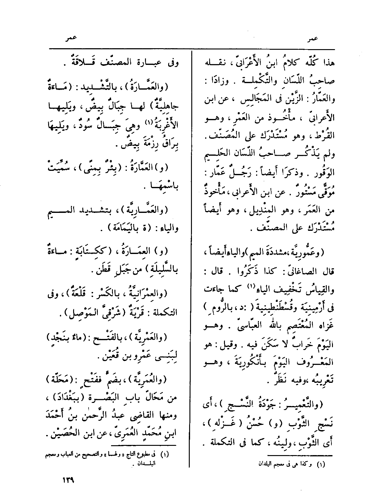 بأَنْكُورِيَةَ، وَهُوَ تَعْرِيبُه، وَفِيه نَظَرٌ. والتَّعْمِيرُ: جَوْدَةُ النَّسْجِ، أَي نَسْجِ الثَّوْبِ وحُسْنُ غَزْلهِ، أَي الثَّوْبِ، ولِينُه، كَمَا فِي التكملة. وَفِي عبارَة المصنّف قَلاقَةٌ. والعَمَّارَةُ، بالتَّشْدِيد: مَاءَةٌ جاهِلِيَّةٌ لَهَا جِبَالٌ بِيضٌ، ويَلِيها الأَغْرِبَةُ وهِيَ جِبَالٌ سُودٌ، ويَلِيهَا بِرَاقُ رِزْمَةَ بِيضُ. والعَمَّارَةُ: بِئْرٌ بِمِنىً، سُمِّيَتْ باسْمِهَا. والعَمَّارِيَّة، بتَشْديد الْمِيم والياءِ: ة باليَمَامَة. والعِمَارَةُ، ككِتَابَةٍ: ماءَةٌ بالسَّلِيلَةِ من جَبَلِ قَطَن. والعِمْرَانِيَّةُ، بالكَسْر: قَلْعَةٌ، وَفِي التكملة: قَرْيَةٌ شَرْقِيَّ المَوْصِل. والعَمْرِيَّة، بالفَتْح: ماءٌ بنَجْدٍ لِبَنِي عَمْرِو بن قُعَيْن. والعُمَرِيَّة، بضَمٍّ ففَتْحٍ: مَحَلّة من مَحَالّ بابِ البَصْرة ببَغْدَادَ، وَمِنْهَا القاضِي عبد الرَّحمن بنُ أَحْمَدَ ابنِ مُحَمّدٍ العُمَرِيّ، عَن ابْن الحُصَيْن.