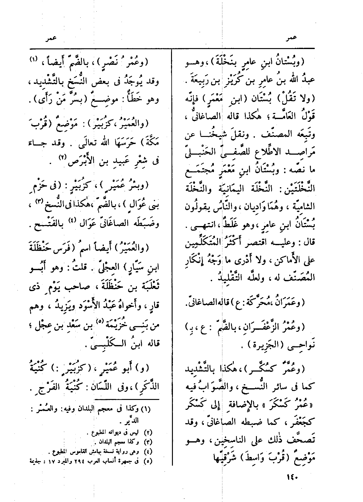 وبُسْتانُ ابنِ عامِرٍ بنَخْلَةَ، وَهُوَ عبدُ الله بنُ عامِرِ بن كُرَيْزِ بن رَبِيعَةَ. وَلَا تَقُلْ بُسْتَان ابنِ مَعْمَرٍ فإِنّه قَوْلُ العَامَّة هَكَذَا قَالَه الصاغانيُّ، وتَبِعَه المصنّف. ونقلَ شيخُنا عَن مَراصِد الاطِّلاع للصَّفِيّ الحَنْبليّ مَا نَصّه: وبُسْتَانُ ابنِ مُعَمَرٍ مُجتَمَع النَّخْلَتَيْن: النَّخْلَة اليمَانِيَة والنَّخْلَة الشامِيّة، وهُمَا وَادِيان، والنّاسُ يقولُون بُسْتَانُ ابنِ عامِرٍ، وَهُوَ غَلَطٌ، انْتهى. قَالَ: وَعَلِيهِ اقْتصر أَكْثَرُ المُتَكَلِّمِين على الأَماكن، وَلَا أَدْري مَا وَجْهُ إِنْكَارِ المُصَنّف لَهُ، ولعلَّه الَّتْقِليدُ. وعَمَرَانُ، مُحَرَّكَة: ع قَالَه الصاغانيّ. وعُمْرُ الزَّعْفَرَانِ، بالضَّمّ: ع، ب نَواحِي الجَزِيرة. وعُمَّرٌ كسُكَّر، هَكَذَا بالتَّشْدِيد كَمَا فِي سَائِر النُّسخ، والصَّوَابُ فِيهِ عُمَرُ كَسْكَرَ بالإِضافةِ إِلى كَسْكَر كجَعْفَر، كَمَا ضَبطه الصاغانيّ، وَقد تَصحَّف ذَلِك على الناسِخين، وَهُوَ مَوْضِعٌ قُرْبَ وَاسِطَ شَرقِيّها وعُمْرُ نَصْرٍ، بالضَّمّ أَيضاً، وَقد يُوجَدُ فِي بعض النُّسَخ بالتَّشْدِيد، وَهُوَ خَطَأٌ: موضِعٌ بسُرَّ مَنْ رَأَى. والعُمَيْرُ، كزُبَيْر: مَوْضِعٌ قُرْبَ مَكَّةَ حَرَسَهَا الله تعالَى. وَقد جاءَ فِي شِعْرِ عَبيدِ بن الأَبْرَص. وبئرُ عُمَيْرٍ، كزُبَيْرٍ: فِي حَزْمِ بني عُوَالٍ، بالضَّمّ، هَكَذَا فِي النُّسخ، وضَبَطَه الصاغَانيّ عَوَال بالفَتْح. والعُمَيْرُ أَيضاً اسمُ فَرَس حَنْظَلَةَ ابنِ سَيّارٍ العِجْليّ. قلتُ: وَهُوَ أَبُو ثَعْلَبَة بن حَنْظَلَةَ، صَاحب يَوْمِ ذِي قارٍ، وأَخواهُ عَبْدُ الأَسْوَد ويَزِيدُ، وهم من بَنِي خُزَيْمَة بن سَعْدِ بن عِجْل قَالَه ابنُ الكَلْبِيّ. وأَبو عُمَيْرٍ، كزُبَيْرٍ: كُنْيَةُ الذَّكَرِ، وَفِي اللّسَان: كُنْيَةُ الفَرْجِ.