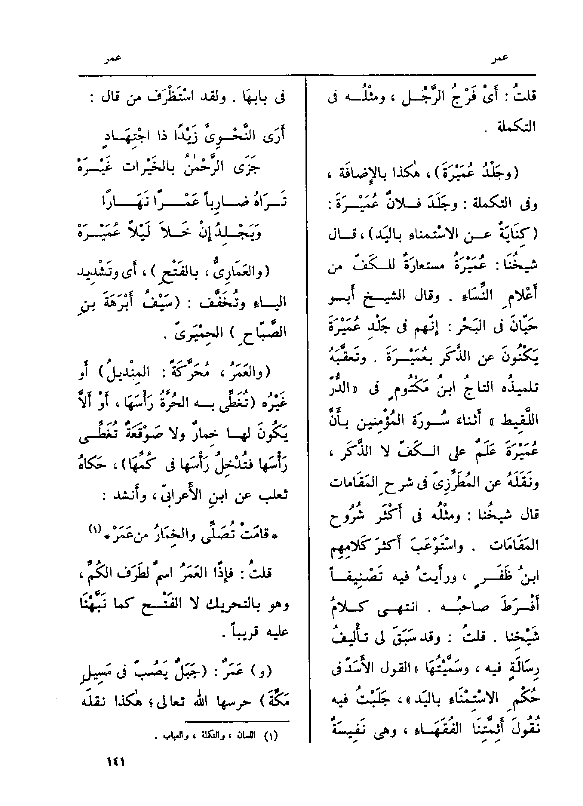 وجَلْدُ عُمَيْرَةَ، هَكَذَا بالإِضافَة، وَفِي التكملة: وجَلَدَ فلانٌ عُمَيْرَةَ: كِنَايَةٌ عَن الاسْتمناءِ باليَد، قَالَ شيخُنَا: عُمَيْرَةُ مستعارَةٌ للكَفّ من أَعْلامِ النِّسَاءِ. وَقَالَ الشَّيْخ أَبو حَيّانَ فِي البَحْر: إِنّهم فِي جَلْدِ عُمَيْرَةَ يَكْنُونَ عَن الذَّكَر بعُمَيْرَةَ. وتَعقَّبَهُ تلميذُه التاجُ ابنُ مَكْتُومٍ فِي الدُّرّ اللَّقِيط أَثناءَ سُورَة المُؤْمِنين بأَنَّ عُمَيْرَةَ عَلَمٌ على الكَفّ لَا الذَّكَر، ونَقَلَهُ عَن المُطَرِّزِيّ فِي شرحِ المَقَامات قَالَ)