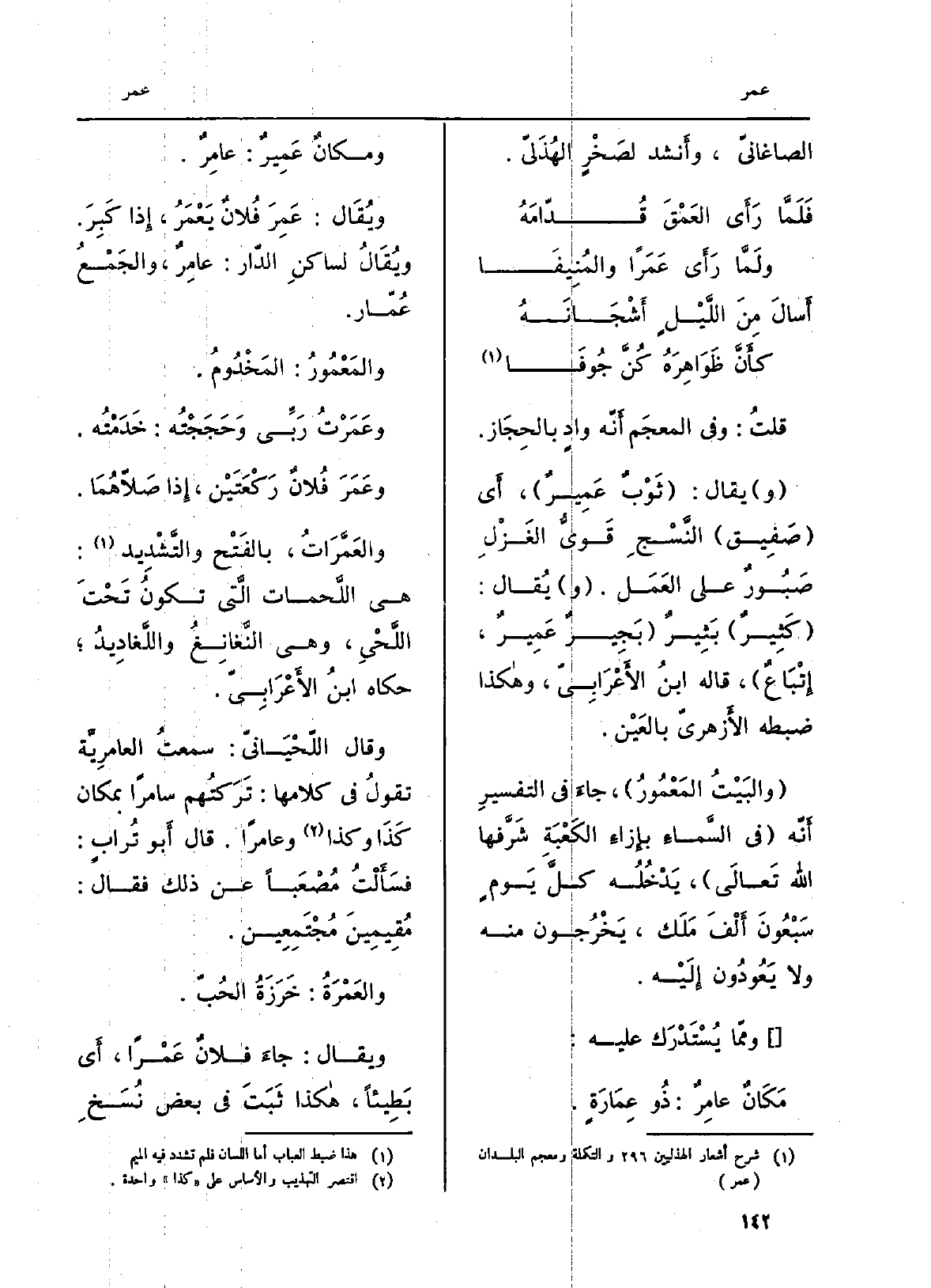 قلتُ: وَفِي المعجَم أَنّه وادٍ بالحِجَاز. وَيُقَال: ثَوْبٌ عَمِيرٌ، أَي صَفِيق النَّسْجِ قَويُّ الغَزْلِ صَبُورٌ على العَمَل. ويُقال: كَثِيرٌ بَثِيرٌ بَجِيرٌ عَمِيرٌ، إِتْبَاعٌ، قَالَه ابنُ الأَعْرَابِيّ، وَهَكَذَا ضَبطه الأَزهريّ بالعَيْن. والبَيْتُ المَعْمُورُ، جاءَ فِي التفسيرِ أَنّه فِي السَّماءِ بإِزاءِ الكَعْبَةِ شَرَّفها الله تَعالَى، يَدْخُلُه كلَّ يَومٍ سَبْعُونَ أَلْفَ مَلَك، يَخْرُجون مِنْهُ وَلَا يَعُودُون إِلَيْه. وممّا يُسْتَدْرك عَلَيْهِ: مَكَانٌ عامِرٌ: ذُو عِمَارَةٍ. ومكانٌ عَمِيرٌ: عامِرٌ. ويُقَال: عَمِرَ فُلانٌ يَعْمَرُ، إِذا كَبِرَ. ويُقَالُ لساكنِ الدّار: عامِرٌ، والجَمْعُ عُمّار. والمَعْمُورُ: المَخْدُومُ. وعَمَرْتُ رَبِّي وَحَجَجْتُه: خَدَمْتُه. وعَمَرَ فُلانٌ رَكْعَتَيْن، إِذا صَلاّهُمَا. والعَمَّرَاتُ، بالفَتْح والتَّشْدِيد: هِيَ اللَّحمات الَّتي تكونُ تَحْتَ اللَّحْىِ، وَهِي النَّغانِغُ واللَّغادِيدُ حَكَاهُ ابنُ الأَعْرَابِيّ. وَقَالَ اللَّحْيَانيّ: سمعتُ العامرِيَّة تقولُ فِي كَلَامهَا: تَرَكتُهم سامراً بمَكَان كَذا وَكَذَا وعامراً. قَالَ أَبو تُرابٍ: فسَأَلْتُ مُصْعَباً عَن ذَلِك فَقَالَ: مُقِيمِينَ مُجْتَمِعِين.