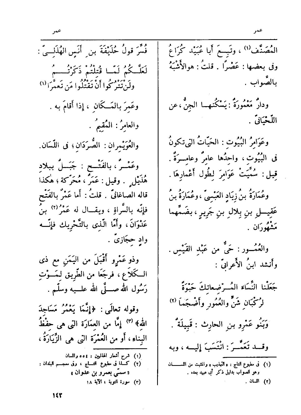 وعَمِرَ بالمَكَانِ، إِذا أَقامَ بِهِ. والعامِرُ: المُقِيمُ. والعُوَيْمِرانِ: الصُّرَدَانِ فِي اللّسَان. وعَمْرٌ، بالفَتْح: جَبَلٌ ببلادِ هُذَيْلٍ. وَقيل: عَمَرٌ، مُحَرّكة هَكَذَا قَالَه الصاغانيّ. قلتُ: أَما عَمْرٌ بالفَتْح فإِنّه بالسَّراةِ، وَيُقَال لَهُ عَمْرُ بنُ عَدْوَانَ، وأَمّا الّذِي بالتَّحْرِيك فإِنّه وادٍ حجَازيّ. وَذُو عَمْروٍ أَقْبَلَ من اليَمَنِ مَعَ ذِي الكَلاَع، فرجَعَا من الطّرِيق لِمَوْتِ رَسُول الله صلَّى الله عَلَيْهِ وسلّم. وَقَوله تعالَى: إِنَّمَا يَعْمُرُ مَسَاجِدَ اللهِ. إِمَّا من العِمَارَة الَّتِي هِيَ حِفْظُ البِناءِ، أَو من العُمْرَة الَّتِي هِيَ الزِّيَارَةُ،