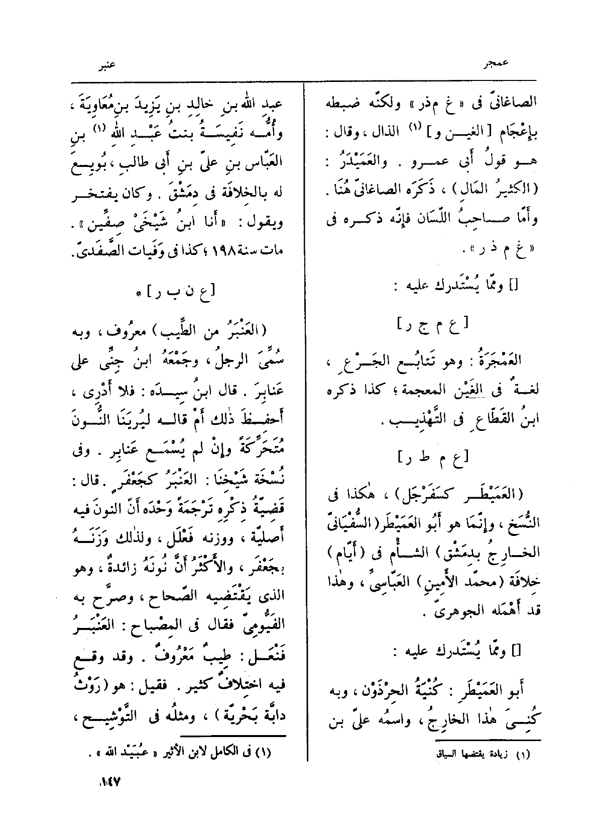 العَنْبَرُ من الطِّيب معرُوف، وَبِه سُمِّىَ الرجلُ، وجَمْعَهُ ابنُ جِنِّى على عَنابِرَ. قَالَ ابنُ سِيدَه: فَلَا أَدْرِي، أَحفِظَ ذَلِك أَم قَالَه ليُريَنَا النُّونَ مُتَحَرِّكَةً وإِنْ لم يُسْمَع عَنابِر. وَفِي نُسْخَةِ شَيْخِنَا: العَنْبَرُ كجَعْفَرٍ. قَالَ قَضِيّةُ ذِكْرِهِ تَرْجَمَةً وَحْدَه أَنّ النونَ فِيهِ أَصليّة، ووزنه فَعْلَلَ، وَلذَلِك وَزَنَهُ بجَعْفَر، والأَكْثَرُ أَنَّ نُونَهُ زائدةٌ، وَهُوَ الَّذِي يَقْتَضِيه الصّحاح، وصرَّح بِهِ الفَيُّومِيّ فَقَالَ فِي المِصْباح: العَنْبَرُ فَنْعَل: طِيبٌ مَعْرُوفٌ. وَقد وَقع فِيهِ اختِلافٌ كثير. فَقيل: هُوَ رَوْثُ دابَّة بَحْريّة، ومثلُه فِي التَّوْشِيح،