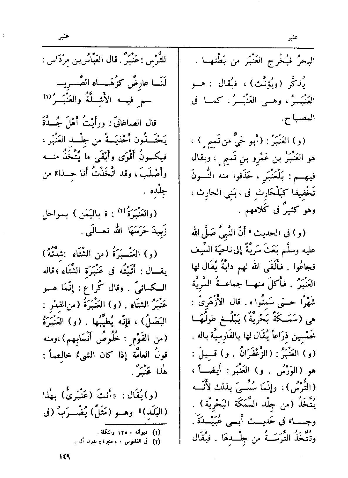 قَالَ الصاغانيّ: ورأَيْتُ أَهْلَ جُدَّةَ يَحْتَذُون أَحْذِيَةً من جِلْدِ العَنْبَر، فيكونُ أَقْوَى وأَبْقَى مَا يُتَّخَذُ مِنْهُ وأَصْلَبَ، وَقد اتَّخَذْتُ أَنا حِذاءً من جِلْدِه. والعَنْبَرَةُ: ة باليَمَن بسواحل زَبِيدَ حَرَسَهَا الله تعالَى. والعَنْبَرَةُ من الشِّتَاءِ: شِدَّتُهُ يُقَال: أَتَيْتُه فِي عَنْبَرَةِ الشِّتَاءِ قَالَه الكسائيّ. وَقَالَ كُراع: إِنّمَا هُوَ عَنْبَرُ الشتَاءِ. والعَنْبَرَةُ من القِدْرِ: البَصَلُ، فإِنّه يُطيِّبُها. والعَنْبَرَةُ من القَوْمِ: خُلُوصُ أَنْسَابِهم، وَمِنْه قولُ العامَّة إِذا كَانَ الشيءُ خالِصاً: هَذَا عَنْبَرٌ. ويُقَال: أَنتَ عَنْبَرِيٌّ بِهَذَا البَلَدِ وَهُوَ مَثَلٌ يُضْرَبُ فِي