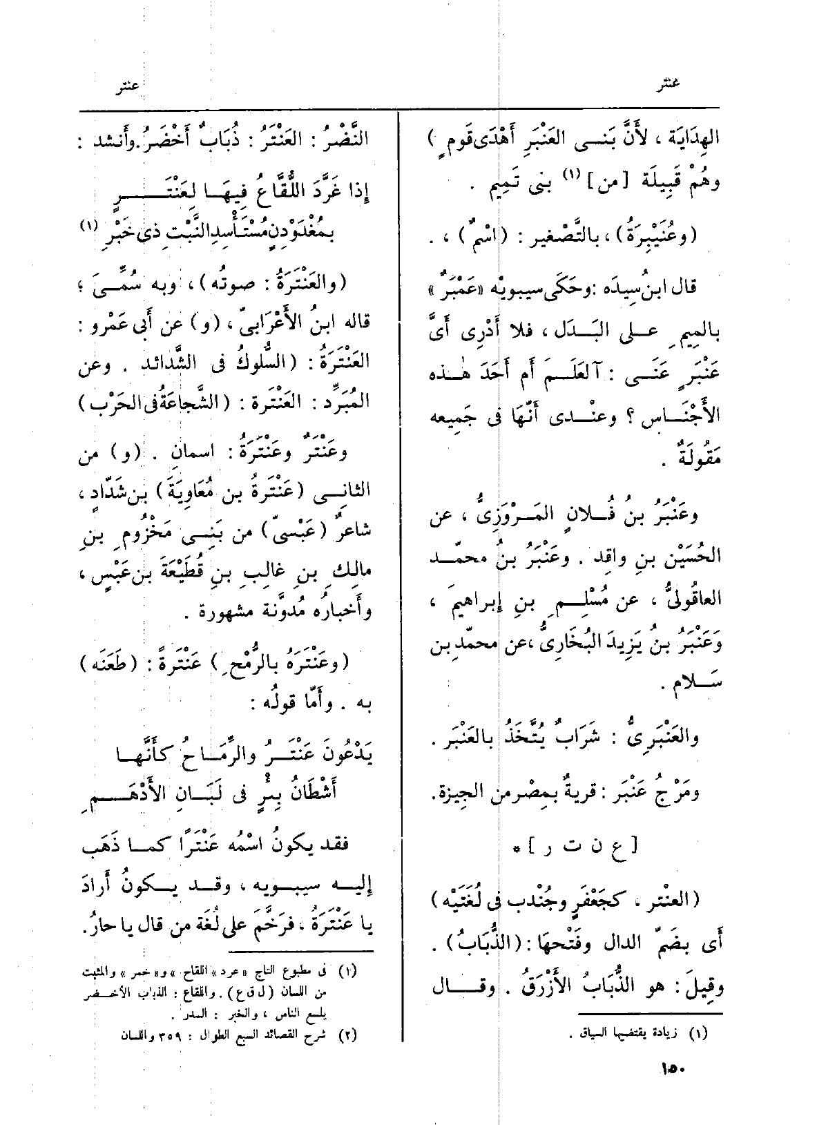 الهِدَايَة، لأَنَّ بَني العَنْبَرِ أَهْدَى قَومٍ وهُمْ قَبِيلَة من بني تَمِيم. وعُنَيْبِرَةُ، بالتَّصْغير: اسْمٌ،. قَالَ ابنُ سِيدَه: وحَكَى سيبويْه عَمْبَرٌ بالمِيمِ على البَدَل، فَلَا أَدْرِي أَيَّ عَنْبَرٍ عَنَى: آلعَلَمَ أَم أَحَدَ هَذِه الأَجْنَاسِ وعنْدي أَنّهَا فِي جَمِيعه مَقُولَةٌ. وعَنْبَرُ بنُ فُلانٍ المَرْوَزِيُّ، عَن الحُسَيْن بنِ واقِد. وعَنْبَرُ بنُ محمّد العاقُوليُّ، عَن مُسْلِمِ بنِ إِبراهِيمَ، وعَنْبَرُ بنُ يَزِيدَ البُخَارِيُّ، عَن محمّدِ بن سَلام. والعَنْبَرِيُّ: شَرَابٌ يُتَّخَذُ بالعَنْبَر. ومَرْجُ عَنْبَر: قريةٌ بمِصْر من الجِيزة.
