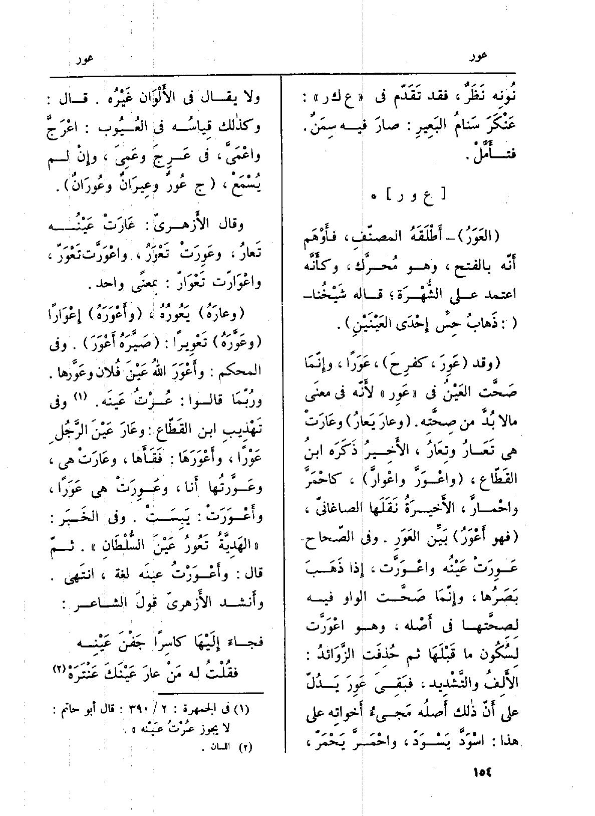 . {العَوَرُ أَطْلَقَهُ المصنّفِ، فأَوْهَم أَنّه بِالْفَتْح، وَهُوَ مُحرَّك، وكأَنَّه اعْتمد على الشُّهْرَة قَالَه شَيْخُنا ذَهابُ حِسِّ إِحْدَى العَيْنَيْنِ. وَقد} عَوِرَ، كفرِحَ، {عَوَراً، وإِنّمَا صَحَّت العَيْنُ فِي عَوِر لأَنّه فِي معنَى مَا لابُدَّ من صِحَّتِه.} وعارَ {يَعارُ} وعَارَتْ هِيَ {تَعَارُ} وتِعَارُ، الأَخِيرُ ذَكَرَه ابنُ القَطّاع، {واعْوَرَّ} واعْوارَّ، كاحْمَرَّ واحْمارَّ، الأَخيرَةُ نَقَلَها الصاغانيّ، فَهُوَ أَعْوَرُ بَيِّن العَوَرِ. وَفِي الصّحاح {عَوِرَتْ عَيْنُه} واعْوَرَّت، إِذا ذَهَبَ بَصَرُها، وإِنّمَا صَحَّت الْوَاو فِيهِ لِصِحَّتها فِي أَصْله، وَهُوَ اعْوَرَّت لِسُكُون مَا قَبْلَهَا ثمَّ حُذِفَت الزَّوَائدُ: الأَلِفُ والتَّشْدِيد، فبَقِى عَوِرَ يَدُلّ على أَنّ ذَلِك أَصْلُه مَجئُ أَخواتِه على هَذَا: اسْوَدَّ يَسْوَدّ، واحْمَرَّ يَحْمَرّ، وَلَا يُقَال فِي الأَلْوَان غَيْرُه. قَالَ: وَكَذَلِكَ قِياسُه فِي العُيثوب: اعْرَجَّ واعْمَىَّ، فِي عَرِجَ وعَمِىَ، وإِنْ لم يُسْمَعْ، ج {عُورٌ} وعِيرَانٌ {وعُورَانٌ. وَقَالَ الأَزهريّ:} عَارَتْ عَيْنُه {تَعاُر،} وعَوِرَتْ {تَعْوَرُ،} واعْوَرَّت {تَعْوَرّ،} واعْوَارّت {تَعْوَارّ: بِمَعْنى وَاحِد.} وعارَُه {يَعُورُهُ،} وأَعْوَرَهُ {إِعْوَاراً} وعَوَّرَهُ {تَعْوِيراً: صَيَّرَهُ} أَعْوَرَ. وَفِي الْمُحكم: {وأَعْوَرَ اللهُ عَيْنَ فُلان} وعَوَّرها. ورُبّمَا قَالُوا: {عُرْتُ عَينَه. وَفِي تَهْذِيبِ ابْن القَطّاع:} وعَارَ عَيْنَ الرَّجُلِ {عَوْراً،} وأَعْوَرَهَا: فَقَأَها، {وعَارَتْ هِيَ،} وعَوَّرتُها أَنا، {وعَوِرَتْ هِيَ} عَوَراً، {وأَعْوَرَتْ: يَبِسَتْ. وَفِي الخَبَر: الهَدِيَّةُ} تَعُورُ عَيْنَ السُّلْطَانِ. ثمّ قَالَ: {وأَعْوَرْتُ عينَه لُغَة، انتَهى.