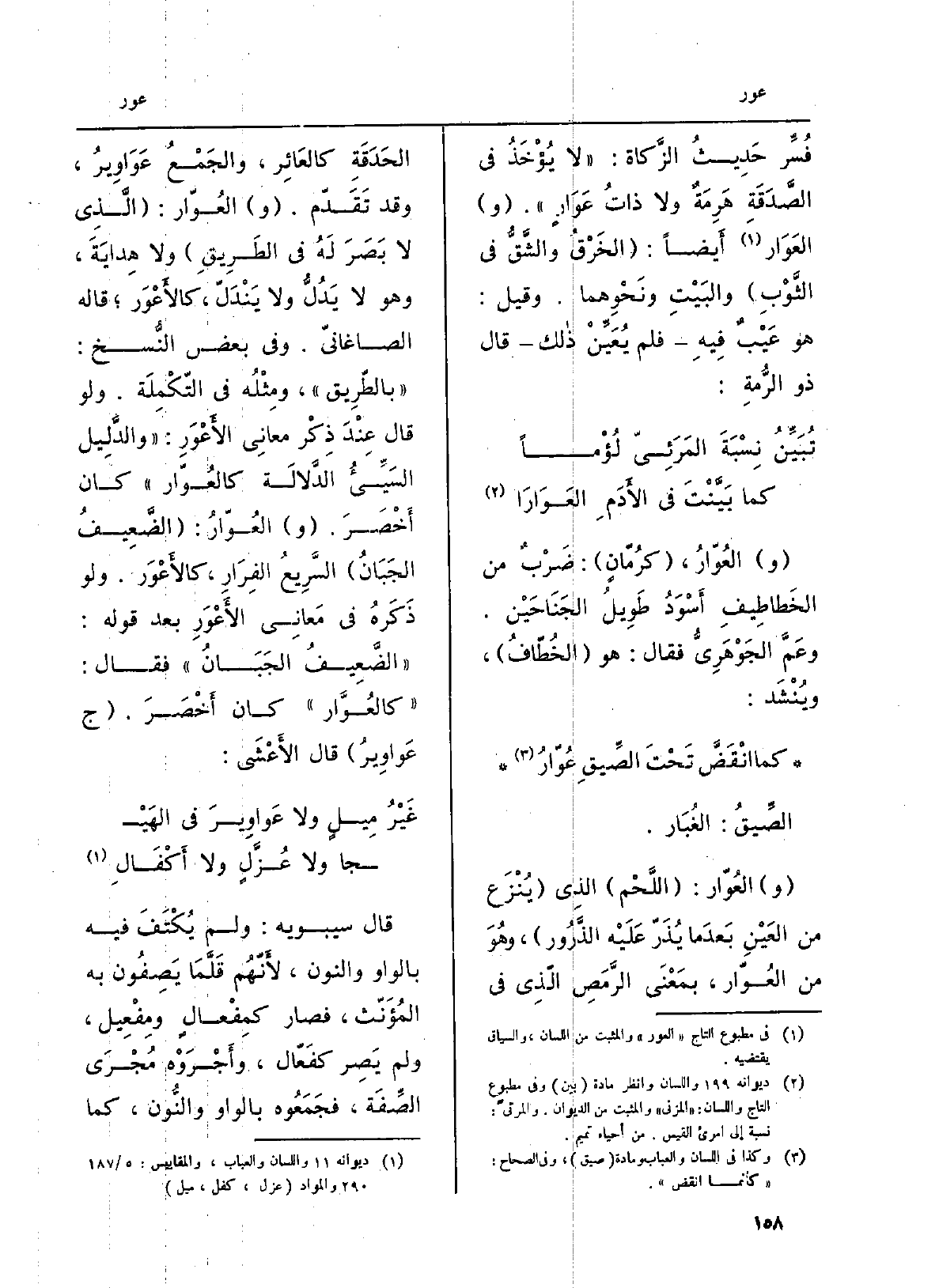 (و) {العُوّارُ، كرُمّانٍ: ضَرْبٌ من الخَطاطِيفِ أَسْوَدُ طَوِيلُ الجَنَاحَيْن. وعَمَّ الجَوْهَرِيُّ فَقَالَ: هُوَ الخُطّافُ، ويُنْشَد: كَمَا انْقَضَّ تَحْتَ الصِّيقِ} عُوّارُ. الصِّيقُ: الغُبَار. والعُوّار: اللَّحْم الذِي يُنْزَع من العَيْنِ بَعدَما يُذَرّ عَلَيْه الذَّرُور، وهُوَ من العُوّار، بمَعْنَى الرَّمَصِ الّذِي فِي الحَدَقَةِ {كالعَائِر، والجَمْعُ} عَوَاويِرُ، وَقد تَقَدّم. والعُوّار: الَّذِي لَا بَصَرَ لَهُ فِي الطَرِيقِ وَلَا هِدايَةَ، وَهُوَ لَا يَدُلُّ وَلَا يَنْدَلّ، كالأَعْوَر قَالَه الصاغانيّ. وَفِي بعض النُّسخ: بالطَّرِيق، ومِثْلُه فِي التّكْمِلَة. وَلَو قَالَ عِنْدَ ذِكْر معانِي الأَعْوَرِ: والدَّلِيل السَيِّئُ الدَّلالَة {كالعُوّار كَانَ أَخْصَرَ. والعُوّارُ: الضَّعِيفُ الجَبَانُ السَّرِيعُ الفِرَارِ،} كالأَعْوَر. وَلَو ذَكَرهُ فِي مَعانِي الأَعْوَرِ بعد قَوْله: الضَّعِيفُ الجَبَانُ فَقَالَ: كالعُوَّار كَانَ أَخْصَرَ. ج عَواوِيرُ قَالَ الأَعْشَى:)