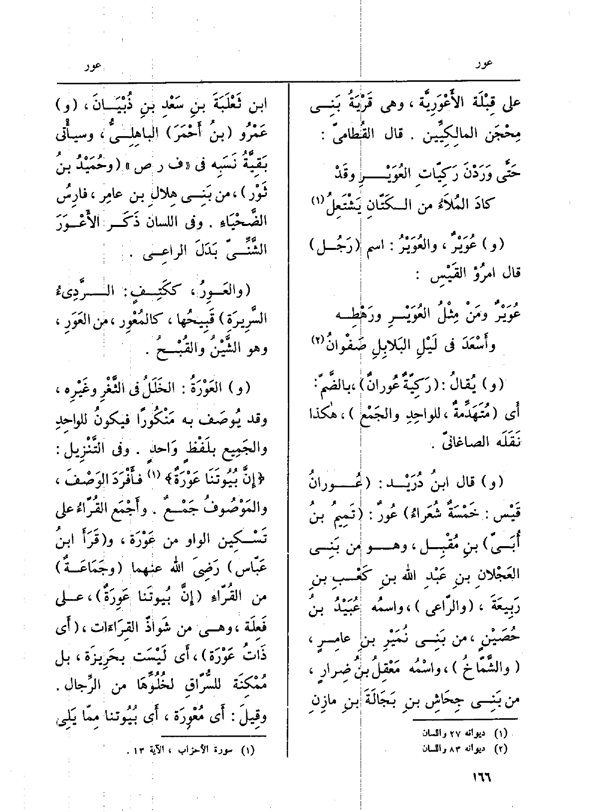 الوَصْفَ، والمَوْصُوفُ جَمْعٌ. وأَجْمَع القُرّاءُ على تَسْكِين الْوَاو من عَوْرَة، وقَرَأَ ابنُ عَبّاس رَضِيَ الله عَنْهُمَا وجَمَاعَةٌ من القُرّاءِ إِنَّ بُيوتَنا {عَوِرَةٌ، على فِعْلَة، وَهِي من شَواذّ القِرَاءَات، أَي ذَاتُ عَوْرَة، أَي لَيْسَت بحَرِيزَة، بل مُمْكِنَة للسُّرّاقِ لخُلُوِّهَا من الرِّجال. وقِيلَ: أَي} مُعْوِرَة، أَي بُيُوتنا مِمّا يَلِي