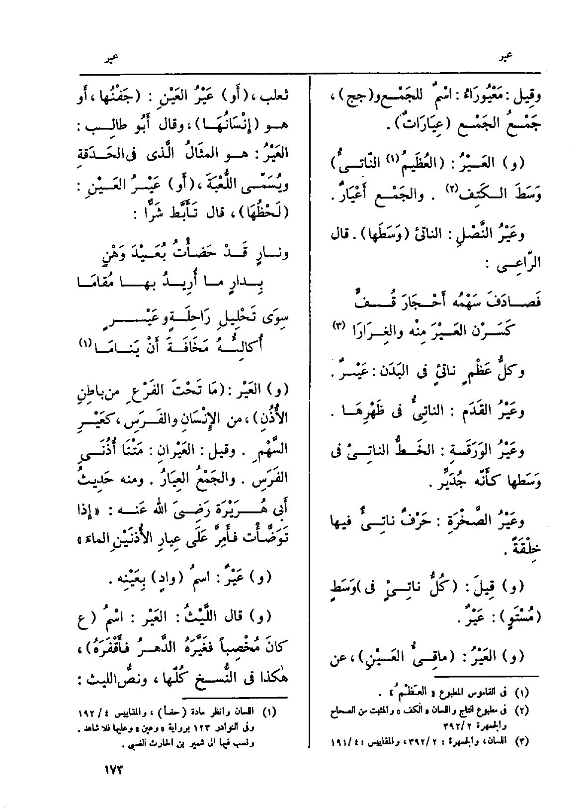 وقِيل: مَعْيُورَاءُ: اسْمٌ للجَمْع وجج، جَمْعُ الجَمْع {عِيارَاتٌ. والعَيْرُ: العُظَيمُ النّاتِئُ وَسَطَ الكَتِف. والجَمْع أَعْيَارٌ.} وعَيْرُ النَّصْلِ: الناتئ وَسَطَها. قَالَ الرّاعِي: