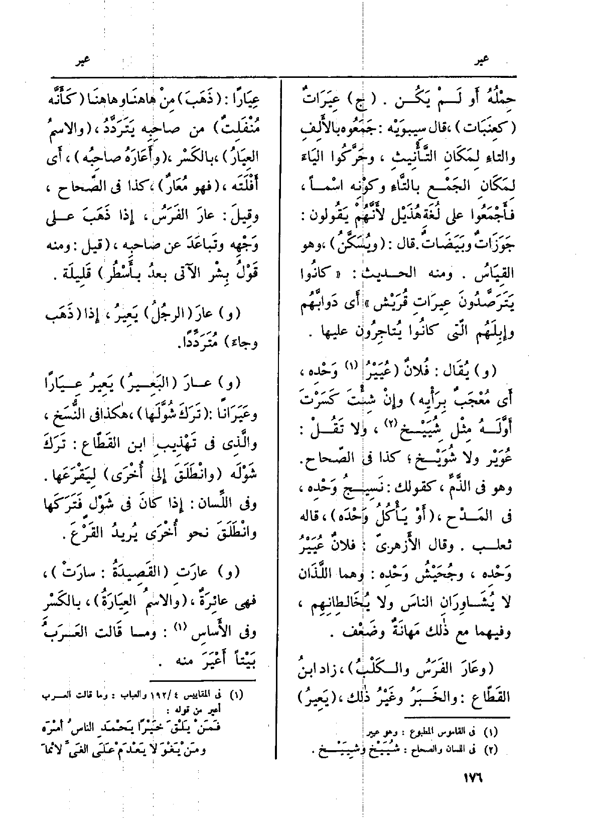 حِمْلُهُ أَو لَمْ يَكُن. ج {عِيَرَاتٌ كعِنَبَات، قَالَ سِيبوَيْه: جَمَعُوه بالأَلِفِ والتاءِ لِمَكَاِن التَّأْنِيثِ، وحَرَّكُوا اليَاءَ لِمَكَانِ الجَمْع بالتّاءِ وكوْنِه اسْماً، فأَجْمَعُوا على لُغَةِ هُذَيْل لأَنَّهُمْ يَقُولون: جَوَزَاتٌ وبَيَضَاتٌ. قَالَ: ويُسَكَّنُ، وَهُوَ القِيَاسُ. وَمِنْه الحَدِيث: كانُوا يَتَرَصَّدُونَ عِيرَاتِ قُرَيْش أَي دَوابَّهُم وإِبِلَهُم الّتي كانُوا يُتاجِرُون عَلَيْهَا. ويُقَال: فُلانٌ} عُيَيْرُ وَحْدِه، أَي مُعْجَبٌ بِرَأْيِه وإِنْ شِئْتَ كَسَرْتَ أَوَّلَهُ مِثْل شُيَيْخ، وَلَا تَقُلْ: عُوَيْر وَلَا شُوَيْخ كَذَا فِي الصّحاح. وَهُوَ فِي الذَّمِّ، كَقَوْلِك: نَسِيجُ وَحْدِه، فِي المَدْح، أَوْ يَأْكُلُ وَحده، قَالَه ثَعْلَب. وَقَالَ الأَزهريّ: فلانٌ عُيَيْرُ وَحْدِه، وجُحَيْشُ وَحْدِه: وهما اللَّذَان لَا يُشَاوِرَانِ الناسَ وَلَا يُخَالِطِانِهِم، وَفِيهِمَا مَعَ ذَلِك مَهَانَةٌ وضَعْف. {وعَارَ الفَرَسُ والكَلْبُ، زَاد ابنُ القَطّاع: والخَبَرُ وغَيْرُ ذَلِك} يَعِيرُ {عِيَاراً: ذَهَبَ مِن هَا هنَا وَهَا هنَا كَأَنَّه مُنْفَلِتٌ من صاحِبِه يَتَرَدَّدُ، والاسمُ} العِيَارُ، بالكَسْر، {وأَعَارَهُ صاحِبُه، أَي أَفْلَتَه، فهُو} مُعَارٌ، كَذَا فِي الصّحاح، وقِيلَ: عارَ الفَرَسُ، إِذا ذَهَبَ على وَجْهِه وتَبَاعَدَ عَن صاحبِه، قيل: وَمِنْه قَوْلُ بِشْر الْآتِي بعدُ بأَسْطُر قَلِيلَة. وعارَ الرجُلُ يَعِيرُ، إِذا ذَهَب وجاءَ مُتَرَدِّداً. وعارَ البَعِيرُ يَعِيرُ عِيَاراً {وعَيَرَاناً: تَرَكَ شُوَّلَها، هَكَذَا فِي النُّسَخ، والَّذِي فِي تَهْذِيبِ ابْن القَطّاع: تَرَكَ شَوْلَه وانْطَلَقَ إِلى أُخْرَى لِيَقْرَعَها. وَفِي اللِّسان: إِذا كانَ فِي شَوْل فَتَرَكَها وانْطَلَقَ نَحْو أُخْرَى يُريدُ القَرْع. (و) } عارَتِ القَصِيدَةُ: سارَتْ، فَهِيَ {عائِرَةٌ، والاسمُ} العِيَارَةُ، بالكَسْر وَفِي الأَساسِ: وَمَا قَالت العَرَبُ بَيْتاً! أَعْيَرَ مِنْهُ