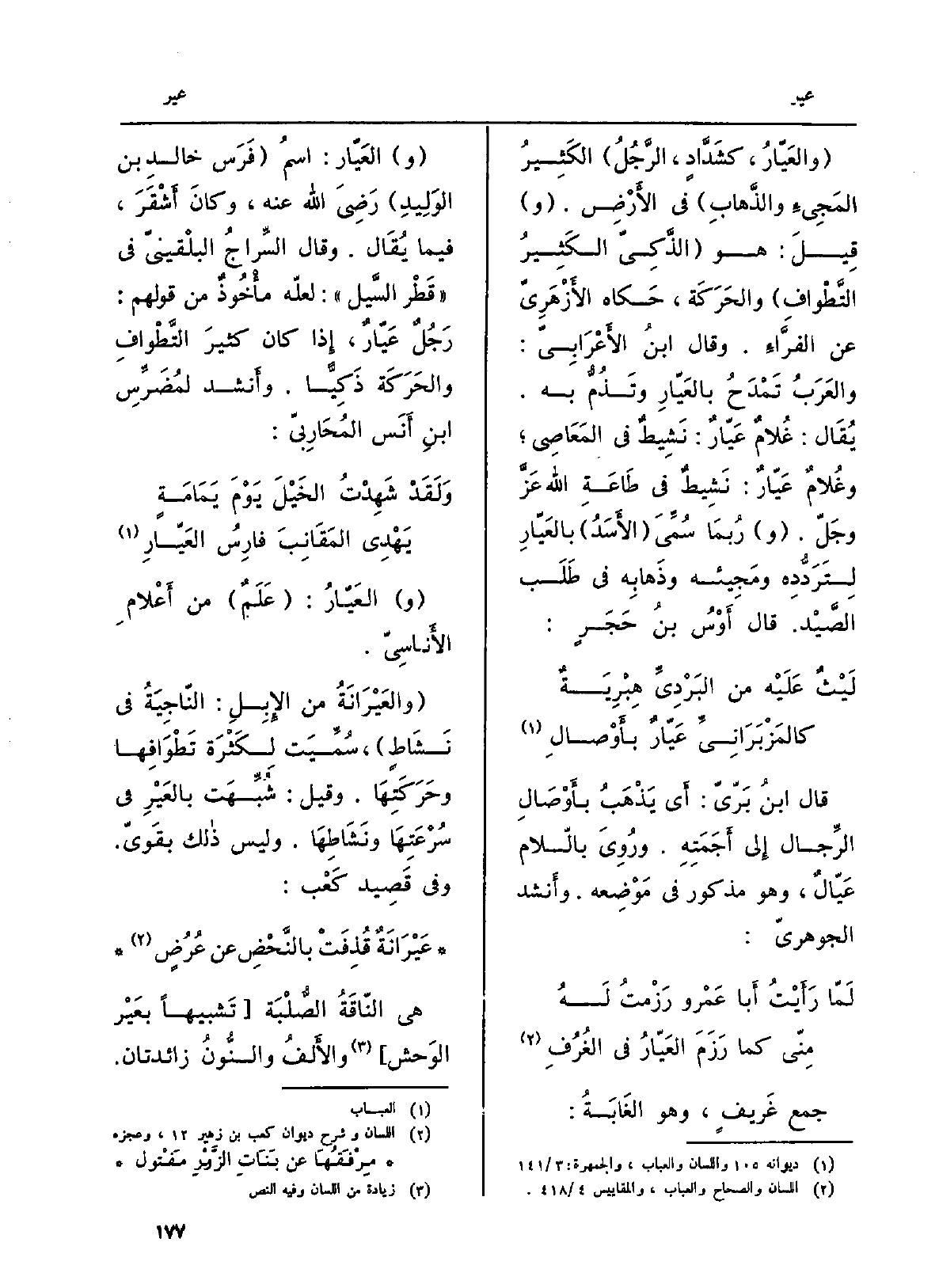 وَقَالَ ابنُ الأَعْرَابِيّ: والعَرَبُ تَمْدَحُ} بالعَيّارِ وتَذُمُّ بِهِ. يُقَال: غُلاٌ م {عَيّارٌ: نَشِيطٌ فِي المَعَاصِي)