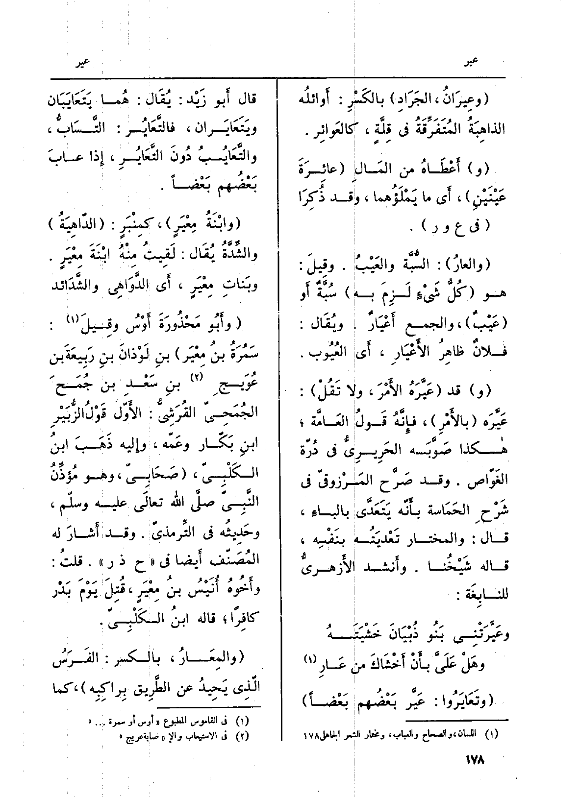 {وتَعَايَرُوا: عَيَّر بَعْضُهم بَعْضاً قَالَ أَبو زَيْد: يُقَال: هُما يَتَعَايَبَان} ويَتَعَايَران، {فالتَّعَايُر: التَّسَابُّ، والتَّعَايُبُ دُونَ} التَّعَايُرِ، إِذا عابَ بَعْضُهم بَعْضاً. وابْنَةُ {مِعْيَرٍ، كمِنْبَرٍ: الدّاهِيَةُ والشِّدَّةُ يُقَال: لَقِيتُ مِنْهُ ابْنَةَ مِعْيَرٍ، وبَناتِ مِعْيَرٍ، أَي الدَّوَاهِي والشَّدَائد وأَبُو مَحْذُورَةَ أَوْسُ وقِيلَ: سَمُرَةُ بنُ مِعْيَر بنِ لَوْذانَ بنِ رَبِيعَةَ بن عُوَيجِ بنِ سَعْدِ بن جُمَحَ الجُمَحِيّ القُرَشِيُّ: الأَوّل قَوْلُ الزُّبَيْرِ ابنِ بَكّار وعَمّه، وإِليه ذَهَبَ ابنُ الكَلْبِيّ، صَحَابِيّ، وَهُوَ مُؤذِّنُ النَّبِيّ صلَّى الله تعالَى عَلَيْهِ وسلّم، وحَدِيثُه)