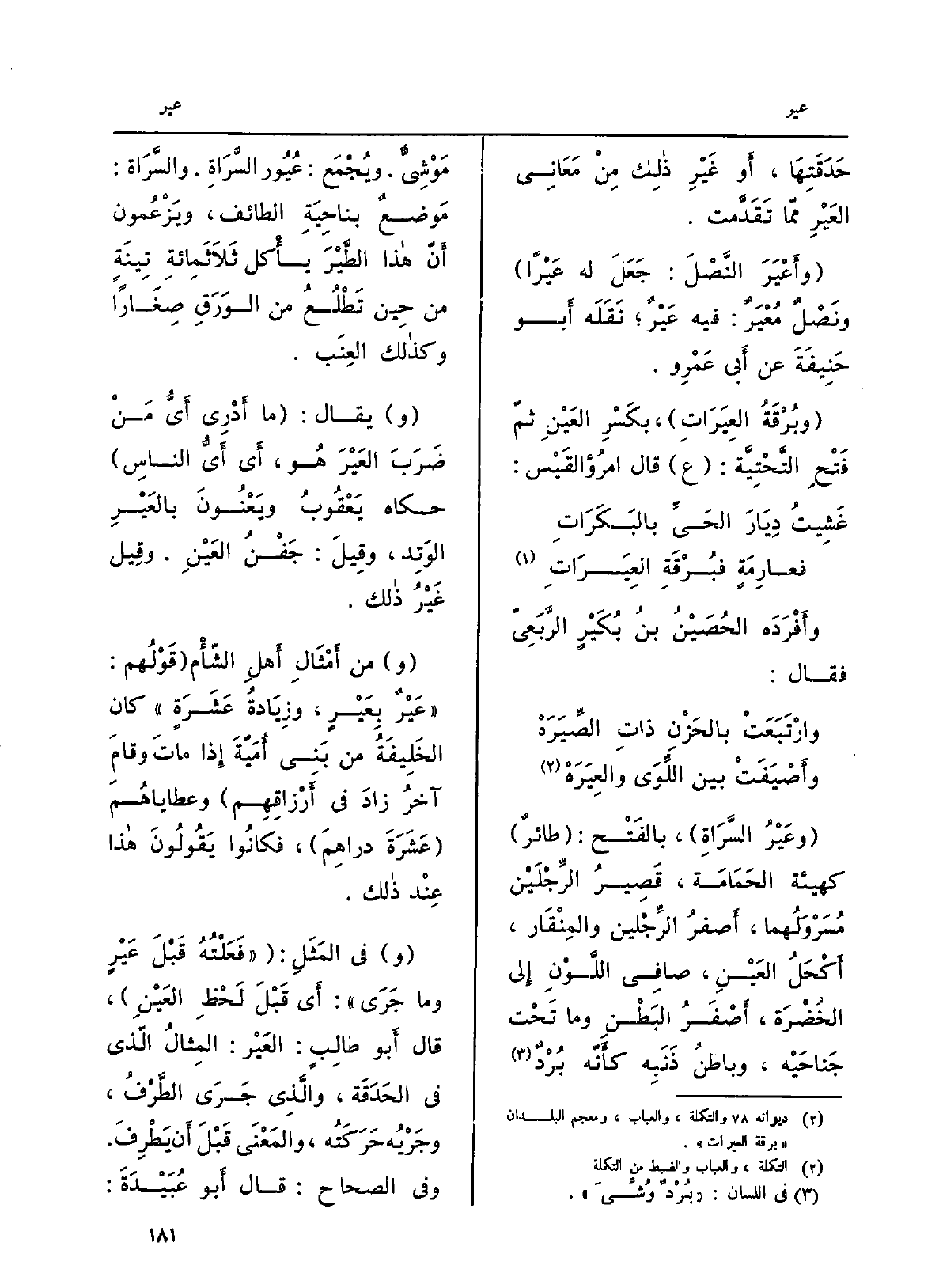 وعَيْرُ السَّرَاةِ، بالفَتْح: طائرٌ كَهَيئَةِ الحَمَامَة، قَصِيرُ الرِّجْلَيْن مُسَرْوَلُهما، أَصفرُ الرِّجْلين والمِنْقَار، أَكْحَلُ العَيْنِ، صافِي اللَّوْنِ إِلى الخُضْرَة، أَصْفَرُ البَطْنِ وَمَا تَحْت جَناحَيْه، وباطنُ ذَنَبهِ كأَنّه بُرْدٌ مَوْشِىً. ويُجْمَع: {عُيُور السَّرَاةِ. والسَّرَاة: مَوضعٌ بناحِيَةِ الطَّائِف، ويَزْعُمون أَنّ هَذَا الطَّيْرَ يأْكل ثَلاَثمائةِ تِينَةٍ من حِين تَطْلُعُ من الوَرَقِ صِغَاراً وَكَذَلِكَ العِنَب. وَيُقَال: مَا أَدْرِى أَيُّ مَنْ ضَرَبَ العَيْرَ هُو، أَي أَيُّ الناسِ حَكَاهُ يَعْقُوبُ ويَعْنُونَ} بالعَيْرِ الوَتِد، وقِيلَ: جَفْنُ العَيْنِ. وقِيل غَيْرُ ذَلِك. وَمن أَمْثَالِ أَهلِ الشّأْم قَوْلُهم: عَيْرٌ! بَعِيْرٍ، وزِيَادةُ عَشَرَةٍ كَانَ الخَلِيفَةُ من بَنِي أُمَيّةَ إِذا ماتَ وقامَ آخرُ زادَ فِي أَرْزاقِهِم وعطاياهُمَ عَشَرَةَ دراهِمَ، فكانُوا يَقُولُونَ هَذَا عِنْد ذَلِك. وَفِي المَثَلِ: فَعَلْتُهُ قَبْلَ عَيْرٍ وَمَا جَرَى: أَي قَبْلَ لَحْظِ العَيْنِ، قَالَ أَبو طالِبٍ: العَيْر: المِثالُ الّذي فِي الحَدَقَة، والَّذِي جَرَى الطَّرْفُ، وجَرْيُه حَرَكَتُه، والمَعْنَى قَبْلَ أَن يَطْرِفَ. وَفِي الصِّحَاح: قَالَ أَبو عُبَيْدَةَ:
