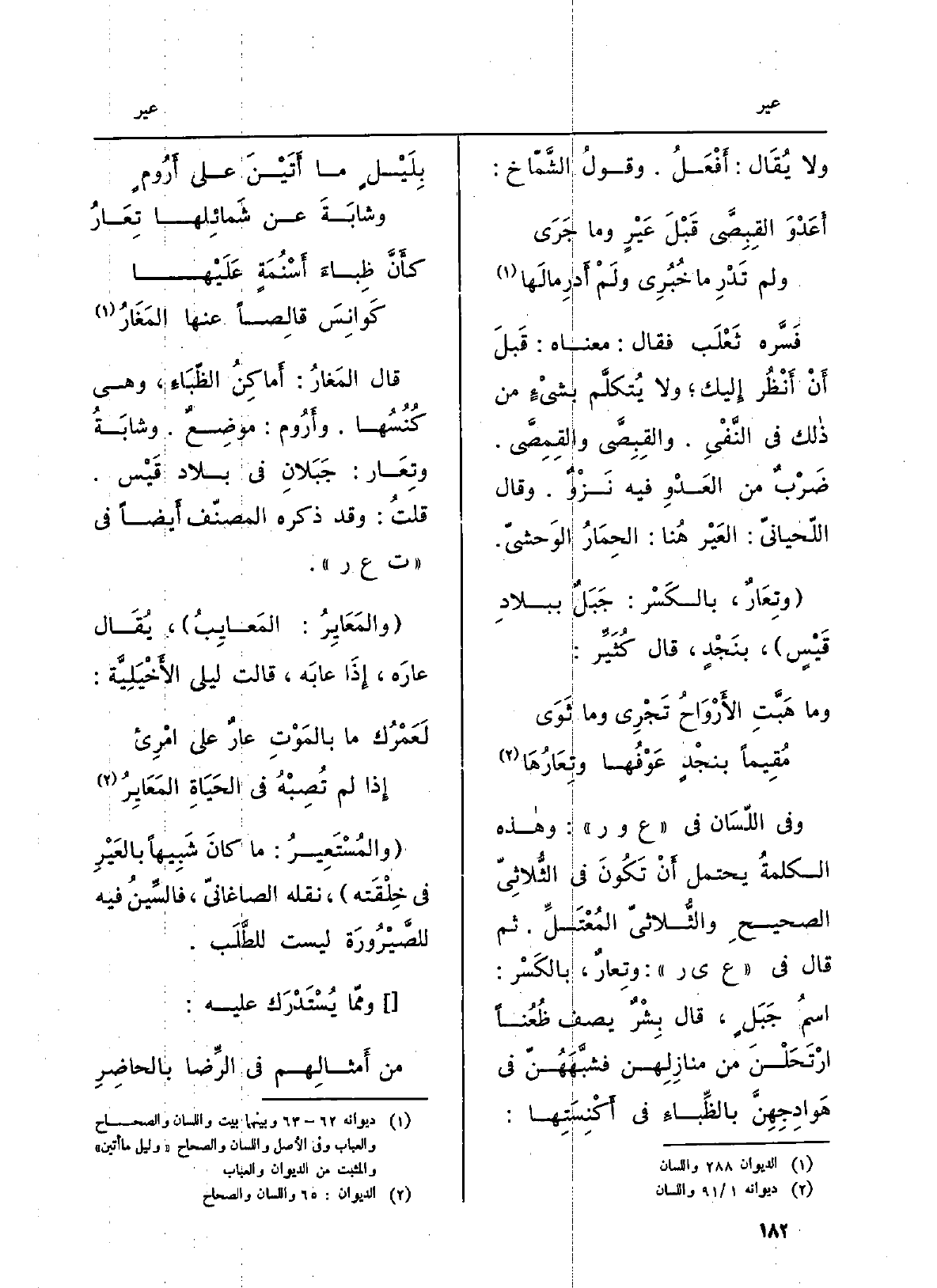 وَفِي اللّسان فِي ع ور: وَهَذِه الكلمةُ يحْتَمل أَن تَكُونَ فِي الثُّلاثِيّ الصحيحِ والثُّلاثيّ المُعْتَلِّ. ثمَّ قَالَ فِي عير: وتِعارٌ، بالكَسْر: اسمُ جَبَلٍ، قَالَ بِشْرٌ يصف ظُعُناً ارْتَحَلْنَ من منازِلِهن فشَّبَههُنّ فِي هَوادِجِهِنَّ بالظِّباءِ فِي أَكْنِسَتِها:
