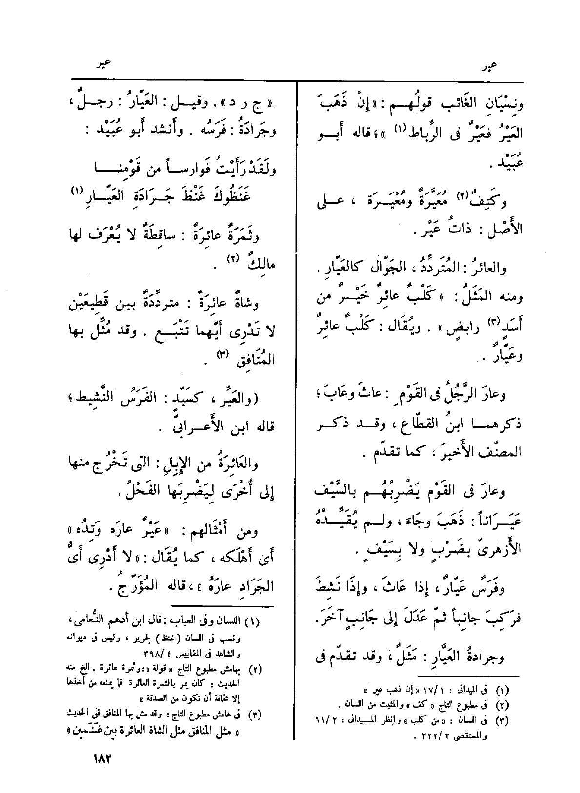 ونِسْيَانِ الغَائب قولُهم: إِنْ ذَهَبَ العَيْرُ {فعَيْرٌ فِي الرِّباط قَالَه أَبو عُبَيْد. وكَتِفٌ} مُعَيَّرَةٌ {ومُعْيَرَة، على الأَصْل: ذاتُ عَيْر.} والعائرُ: المُتَردِّدُ، الجَوّال كالعَيّارِ. وَمِنْه المَثَلُ: كَلْبٌ {عائِرٌ خَيْرٌ من أَسَدٍ رابضٍ. ويُقَال: كَلْبٌ} عائِرٌ {وعَيّارٌ.} وعارَ الرَّجُلُ فِي القَوْمِ: عاثَوعَابَ ذكرهمَا ابنُ القطّاع، وَقد ذكر المصنّف الأَخيرَ، كَمَا تقدّم. وعارَ فِي القَوْم يَضْرِبُهُم بالسَّيْف عَيَرَاناً: ذَهَبَ وجَاءَ، وَلم يُقَيِّدْهُ الأَزهريّ بضَرْبٍ وَلَا بِسَيْفٍ. وفَرَسٌ {عَيّارٌ، إِذا عاثَ، وإِذَا نَشِطَ فرَكِبَ جانِباً ثمّ عَدَلَ إِلى جَانِبٍ آخَرَ. وجرادةُ} العَيَّارِ: مَثَلٌ، وَقد تقدّم فِي ج ر د. وَقيل: العَيّارُ: رجلٌ، وجَرادَةُ: فَرَسُه. وأَنشد أَبو عُبَيْد: