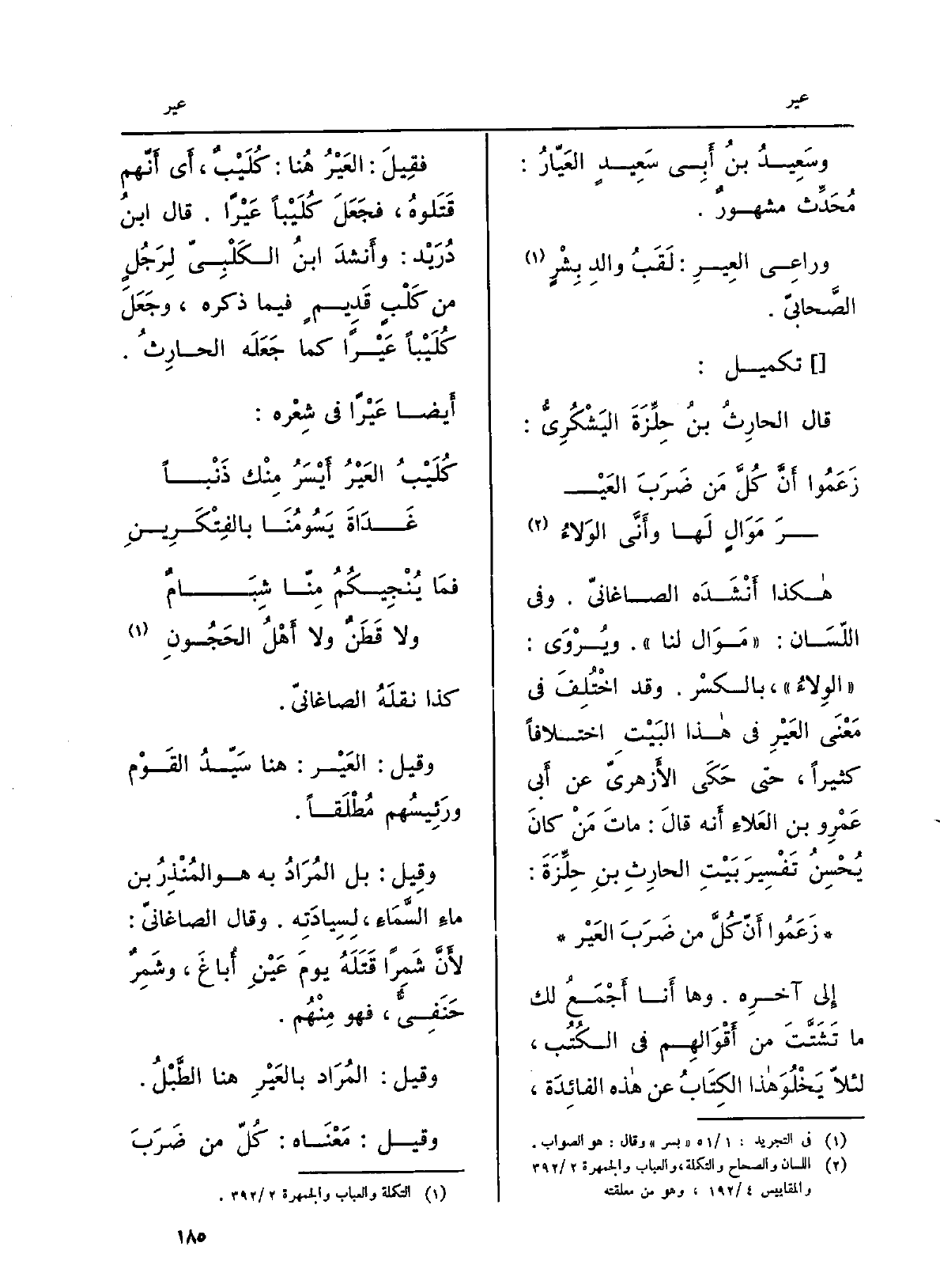 وَهَا أَنا أَجْمَعُ لَك مَا تَشَتَّتَ من أَقْوَالهِم فِي الكُتُب، لئلاّ يَخْلُو هَذا الكِتَابُ عَن هَذِه الفائِدَة، فقِيلَ: العَيْرُ هُنا: كُلَيْبٌ، أَي أَنّهم قَتَلوهُ، فجَعَلَ كُلَيْباً عَيْراً. قَالَ ابنُ دُرَيْد: وأَنشدَ ابنُ الكَلْبِيّ لِرَجُلٍ من كضلْبٍ قَديمٍ فِيمَا ذكره، وجَعَلَ كُلَيْباً عَيْراً كَمَا جَعَلَه الحارِثُ. أَيضاً عَيْراً فِي شِعْره: