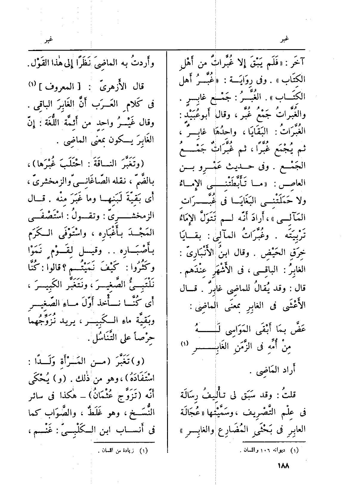 أَرَادَ المَاضِي. قلتُ: وَقد سَبَق لي تأْلِيفُ رِسَالَة فِي عِلْم التَّصْرِيف، وسَمَّيْتها عُجَالَة العابِرِ فِي بَحْثَيِ المُضَارِع والغابِرِ وأَردتُ بِهِ الماضِيَ نَظَراً إِلى هَذَا القَوْل. قَالَ الأزهريّ: الْمَعْرُوف فِي كَلامِ العَرَب أَنَّ الغَابِرَ الباقِي. وَقَالَ غَيْرُ واحِدٍ من أَئِمَّة اللُّغَة: إِنّ الغَابِرَ يكون بِمَعْنى الماضِي.