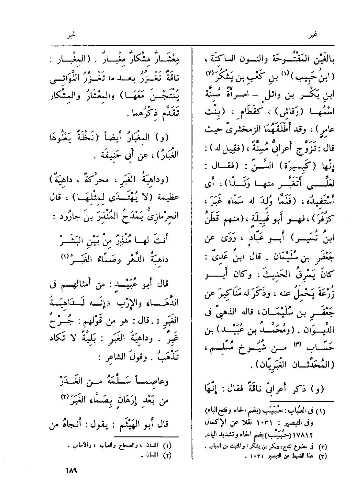 بالغَيْن المَفْتُوحَة وَالنُّون الساكِنَة، ابنُ حَبِيب بنِ كَعْبِ بن يَشْكُرَ ابنِ بَكْر بن وائِلٍ امرأَةً مُسِنَّة اسْمُها رَقاشِ، كقَطَامِ، بِنْت عامِرٍ، وَقد أَطْلَقَهُمَا الزمخشريّ حَيْثُ قَالَ: تَزَوَّج أَعرابيُّ مُسِنَّةً، فقِيل لَهُ: إِنّها كَبِيرَة السَّنَ: فَقَالَ: لعَلِّي أَتَغَبَّر مِنْهَا وَلَداً، أَي أَسْتَفِيدُه، فَلَمَّا وُلِدَ لَهُ سَمّاه غُبَرَ، كزُفَرَ، فَهُوَ أَبو قَبِيلَةٍ، مِنْهُم قَطَنُ ابنُ نُسَير أَبو عَبّادٍ، رَوَى عَن جَعْفَرِ بن سُلَيْمَان. قَالَ ابنُ عَدِيّ: كانَ يَسْرِقُ الحَدِيثَ، وَكَانَ أَبو زُرْعَةَ يَحْمِلُ عَنهُ، وذَكَرض لَهُ مَنَاكِيرَ عَن جَعْفَرِ بنِ سُلَيْمَان قَالَه الذهبيّ فِي الدِّيوَان. ومُحَمَّدُ بن عُبَيْد بن حَسّاب من شُيُوخ مُسّلِم، المُحَدِّثان الغُبَرِيّان. وَذكر أَعرابيّ ناقَةً فَقَالَ: إِنّهَا مِعْشَارٌ مِشْكارٌ مِغْبارٌ. المِغْبار: ناقَةٌ تَغْزُرُ بعد مَا تَغْزُرُ اللَّوَاتِي يُنْتَجْنَ مَعَهَا والمِعْشَارُ والمِشْكار تَقَدَّم ذِكْرُهما. والمِغْبَارُ أَيضاً نَخْلَةٌ يَعْلُوهَا الغُبَارُ، عَن أَبي حَنِيفَة. وداهِيَةُ الغَبَرِ، محرَّكةً، داهِيَةٌ عَظِيمَة لَا يُهْتَدَى لِمِثْلِهَا، قَالَ الحِرْمازِيُّ يَمْدَحُ المُنْذِرَ بنَ جارُود: