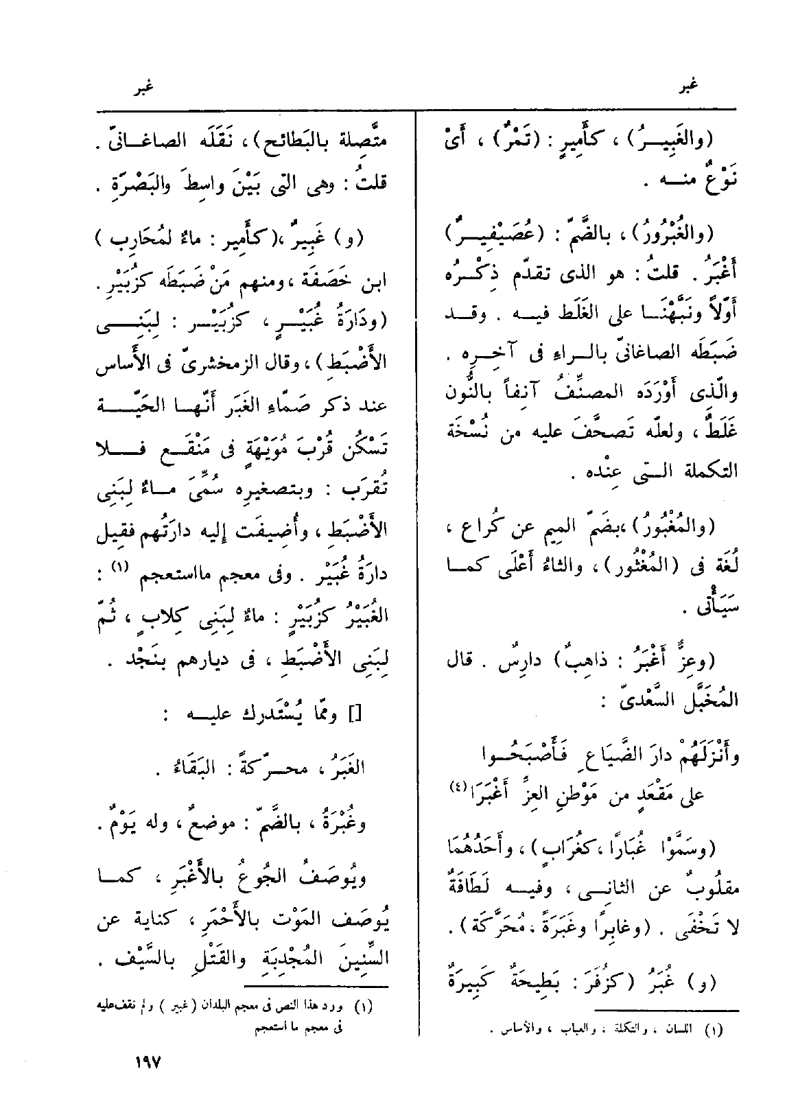 وسَمَّوْا غُبَاراً، كغُرَابٍ، وأَحْدُهُمَا مقلُوبٌ عَن الثانِي، وَفِيه لَطَافَةٌ لَا تَخْفَى. وغابِراً وغَبَرَةً، مُحَرَّكَة. وغُبَرُ كزُفَرَ: بَطِيحَةٌ كَبِيرَةٌ متَّصِلة بالبَطائح، نَقَلَه الصاغانيّ. قلتُ: وَهِي الَّتِي بَيءنَ واسِطَ والبَصْرَةِ. وغَبِيرٌ، كأَمِير: ماءٌ لمُحَارِب ابْن خَصَفَة، وَمِنْهُم مَن ضَبَطَه كزُبَيْرٍ. ودَارَةُ غُبَيْرٍ، كزُبَيْر: لِبَنِي الأَضْبَطِ، وَقَالَ الزمخشريّ فِي الأَساس عِنْد ذكر صَمّاءِ الغَبَر أَنّها الحَيّة تَسْكُن قُرْبَ مُوَيْهَةٍ فِي مَنْقَع فَلَا تُقرَب: وبتصغيرِه سُمِّيَ ماءٌ لِبَنِي الأَضْبَطِ، وأُضِيفَت إِليه دارَتُهم فقِيل دارَةُ غُبَيْر. وَفِي مُعْجم مَا استعجم: الغُبَيْرُ كزُبَيْرٍ: ماءٌ لِبَنِي كِلابٍ، ثُمّ لِبَنِي الأَضْبَطِ، فِي دِيَارهمْ بنَجْد. وممّا يُسْتَدرك عَلَيْهِ: الغَبَرُ، محرّكةً: البَقَاءُ. وغُبْرَةُ، بالضَّمّ: موضعٌ، وَله يَوْمٌ. ويُوصَفُ الجُوعُ بالأَغْبَرِ، كَمَا يُوصَف المَوْت بالأَحْمضرِ، كِنَايَة عَن السِّنِينَ المُجْدِبَةِ والقَتْلِ بالسَّيْف.