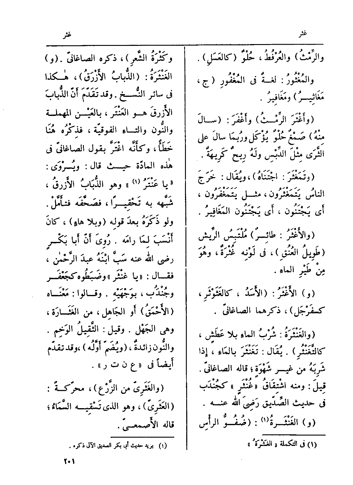والرِّمْثُ والعُرْفُطُ، حُلْوٌ كالعَسَلِ والمُغْثُورُ: لغةٌ فِي المُغْفُورِ ج، مَغَاثِيرُ ومَغَافِيرُ. وأَغْثَرَ الرِّمْثُ وأَغْفَرَ: سالَ مِنْهُ صَمْغٌ حُلْوٌ يُؤْكَل ورُبَما سالَ على الثَّرَى مِثْلَ الدِّبْسِ ولَهُ رِيحٌ كَرِيهَةٌ. وتَمَغْثَرَ: اجْتَنَاهُ، ويُقَال: خَرَجَ الناسُ يَتَمَغْثَرُون، مثل يَتَمَغْفَرُون، أَي يَجْتَنُون، أَي يَجْتَنُون المَغَافِيرُ. والأَغْثَرُ: طائِرٌ مُلْتَبِسُ الرِّيش طَوِيلُ العُنُقِ، فِي لَوْنِه غُثْرَةٌ، وهُوَ مِنْ طَيْرِ الماءِ. والأَغْثَرُ: الأَسَدُ، كالغَثَوْثَرِ، كسَفَرْجَل، ذكرهمَا الصاغانيّ. والغَنْثَرَةُ: شُرْبُ الماءِ بِلَا عَطَشٍ، كالتَّغَنْثُرِ. يُقَال: تَغَنْثَرَ بالمَاءِ، إِذا شَرِبَهُ من غير شَهْوَةٍ قَالَه الصاغانيّ. قِيلَ: وَمِنْه اشْتِقَاقُ غُنْثَرٍ كجُنْدَب فِي حَدِيث الصِّدّيق رَضِيَ الله عَنهُ. والغَنْثَرةُ: ضُفُوُّ الرأْسِ وكَثْرَةُ الشَّعرِ، ذكره الصاغانيّ. والغَنْثَرَةُ: الذُّبابُ الأَزْرَقُ، هَكَذَا فِي سَائِر النُّسخ. وَقد تَقَدَّمَ أَنّ الذُّبابَ الأَزرقَ هُوَ العَنْتَر، بالعَيْن الْمُهْملَة والنُّون والتاءِ الفوقيّة، فذِكْرُه هُنَا خَطَأٌ، وكأَنَّه اغْتَرَّ بقول الصاغانيّ فِي هَذِه المادّة حَيْثُ قَالَ: ويُرْوَى: يَا عَنْتَرُ وَهُوَ الذُّبَابُ الأَزرقُ، شَبَّهه بِهِ تَحْقِيراً، فصَحَّفَه فتَأَمَّلْ. وَلَو ذَكَرَهُ بعدَ قَولِه وَبلا هاءٍ، كانَ أَنْسَبَ لِمَا رامَه. رُوِىَ أَنّ أَبا بَكْرٍ رَضِي الله عَنهُ سَبَّ ابْنَهُ عبدَ الرَّحْمن، فَقَالَ: يَا غنْثَر وضَبَطُوه كجَعْفَر وجُنْدُب، بوَجْهَيْهِ. وَقَالُوا: مَعْنَاه الأَحْمَقُ أَو الجَاهِل، من الغَثَارَة، وَهِي الجَهْل. وَقيل: الثَّقِيلُ الوَخِم. والنُّون زائدةٌ، ويُضَمّ أَوَّلُه، وَقد تقدّم أَيضاً فِي ع ن ت ر. والغَثَرِىّ من الزَّرع، محرّكةً: العَثَرِىّ، وَهُوَ الَّذِي تَسْقِيه السَّمَاءُ قَالَه الأَصمعيّ.