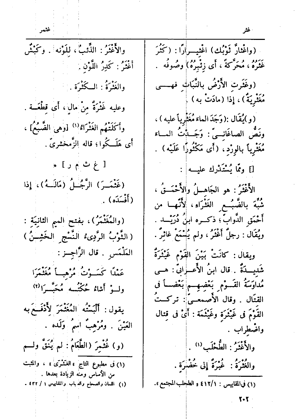 القِتَال. وَقَالَ الأَصمعيّ: تركتُ القَوْمَ فِي غَيْثَرَةٍ وغَيْثَمَة: أَيْ فِي قِتال واضْطِراب. والأَغْثَرُ: الطُّحْلَب. والغُثْرَةُ: غُبْرَةٌ إِلى خُضْرَةٍ. والأَغْثَرُ: الذِّئبُ، لِلَوْنه. وكَبْشٌ أَغْثَرُ: كَدِرُ اللَّوْنِ.