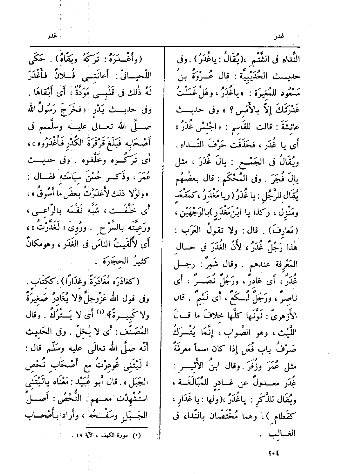 وَفِي حَدِيث عُمَرَ، وذَكر حُسْنَ سِيَاسَتهِ فَقَالَ: ولوْلا ذَلِك لأَغْدَرْتُ بعضَ مَا أَسُوقُ، أَي خَلَّفْت، شَبَّه نَفْسَه بالرّاعِي، ورَعِيَّتَه بالسَّرْحِ. ورُوِىَ لَغَدَّرْتُ، أَي لأَلْقَيتُ الناسَ فِي الغَدَر، وَهُوَ مكانٌ كثيرُ الحِجَارَة. كغَادَرَة مُغَادَرَةً وغِدَاراً، ككِتَابٍ. وَفِي قَول الله عَزَّ وجلَّ: لَا يُغَادِرُ صَغِيرَةً وَلَا كَبِيرةً. أَي لَا يَتْرُكُ. وَقَالَ المُصَنّف: أَي لَا يُخِلّ. وَفِي الحَدِيث أَنّه صلَّى الله تعالَى عَلَيْهِ وسَلّم)