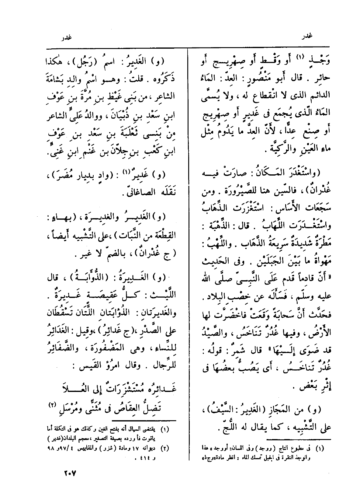 وَجْذٍ أَو وَقْطٍ أَو صِهْرِيج أَو حائِر. قَالَ أَبو مَنْصُورٍ: العِدّ: المَاءُ الدَّائِم الَّذِي لَا انْقطاع لَهُ، وَلَا يُسمَّى المَاءُ الّذي يُجمَع فِي غَدِيرٍ أَو صِهْرِيج أَو صِنْع عِدّاً، لأَنّ العِدَّ مَا يَدُومُ مِثْل ماءِ العَيْنِ والرَّكِيَّة. واسْتَغْدَرَ المَكَانُ: صارَتْ فِيهِ غُدْرانٌ، فالسّين هُنَا للصَّيْرُورَة. وَمن سَجَعَات الأَسَاس: اسْتَغْزَرَت الذِّهَابُ واسْتَغْدَرَت اللِّهَابُ. قَالَ: الذِّهْبَة: مَطْرَةٌ شَدِيدَةٌ سَرِيعَةُ الذَّهَاب. واللَّهْبُ: مُهْواةُ مَا بَينَ الجَبَلَيْن. وَفِي الحَدِيث أَنّ قادِماً قَدم عَلَى النَّبِيّ صلَّى الله عَلَيْهِ وسلّم، فَسَأَلَه عَن خِصْبِ البِلاد. فحَدَّث أَنَّ سَحابَةً وَقَعَتْ فاخْضَرَّت لَهَا الأَرْضُ، فِيهَا غُدْرٌ تَنَاخَسُ، والصَّيْدُ قد ضَوَى إِلَيْهَا قَالَ شَمِرٌ: قولُه: غُدُرٌ تَناخَسُ، أَي يَصُبُّ بعضُهَا فِي إِثْرِ بَعْض. وَمن المَجَازِ الغَدِيرُ: السَّيْفُ، على التَّشْبِيه، كَمَا يُقَال لَهُ اللُّجّ. والغَدِيرُ: اسمُ رَجُل، هَكَذَا ذَكَرُوه. قلتُ: وَهُوَ اسْمُ والِدِ بَشامَةَ الشاعِر، من بَنِي غَيْظِ بنِ مُرَّةَ بنِ عَوْفِ ابنِ سَعْدِ بنِ ذُبْيَانَ، ووالدُ عَلِيٍّ الشَّاعِر مِنْ بَنِي ثَعْلَبَةَ بنِ سَعْدِ بنِ عَوْفِ ابنِ كَعْبِ بنِ جِلاّنَ بن غَنْمِ ابنِ غَنِىٍّ. وغَدِيرٌ: وادٍ بديار مُضَرَ، نَقَلَه الصاغانيّ. والغَدِيرِ والغدِيرَة، بهاءٍ: القِطْعَة من النَّبَات، على التَّشْبيه أَيضاً، ج غُدْرانٌ، بالضمّ لَا غير. والغَدِيرَةُ: الذُّؤَابَةُ، قَالَ اللَّيْث: كلُّ عَقِيصَةٍ غَدِيرَةٌ. والغَديرَتانِ: الذُؤابَتانِ اللَّتَان تَسْقُطَان على الصَّدْرِ، ج غَدائِرُ، وقِيل: الغَدَائِرُ لِلنِّساءِ، وَهِي المَضْفُورَة، والضَّفَائِرُ للرِّجال. وَقَالَ امرُؤ القَيس: