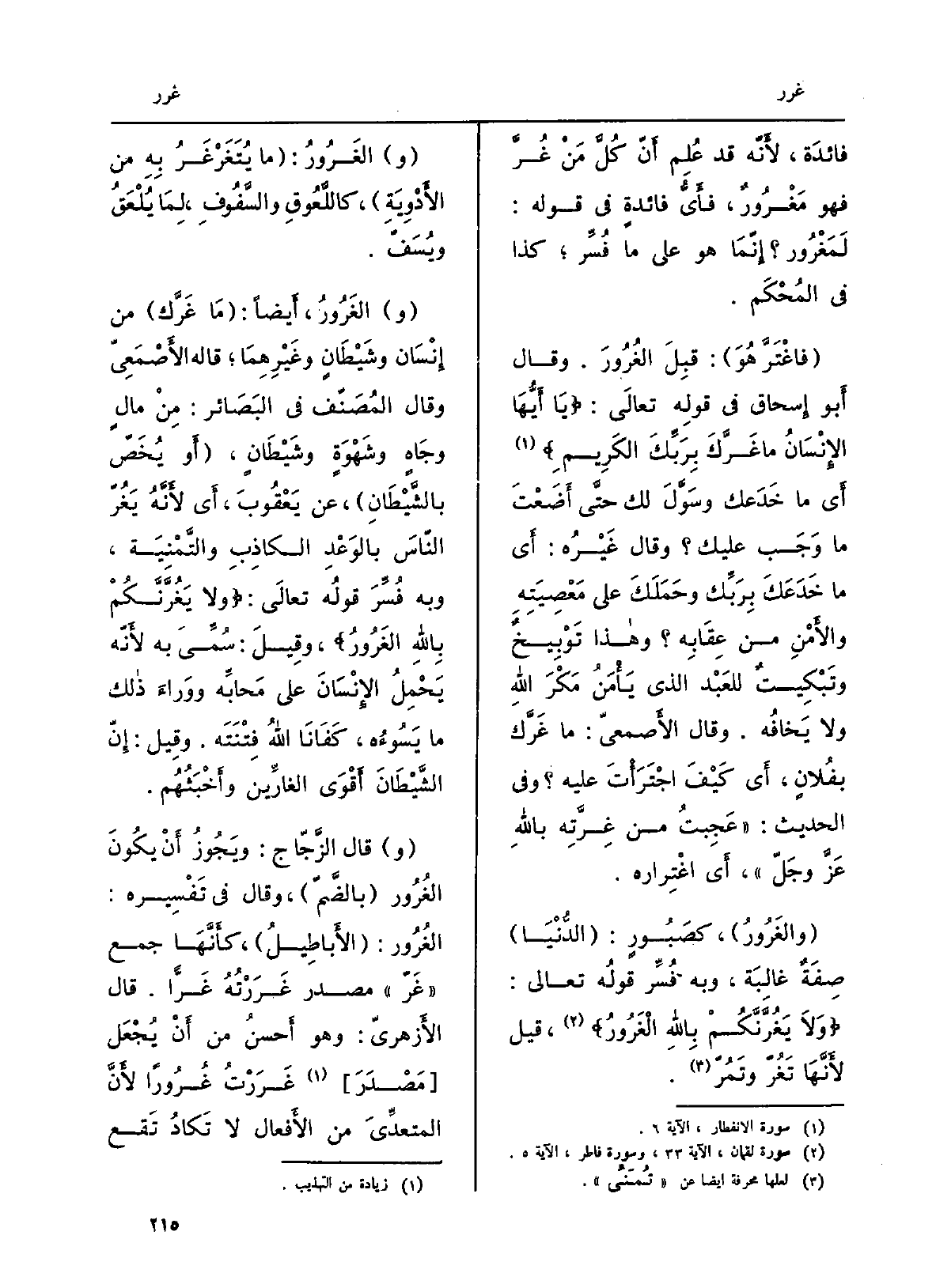 ِ فائدَة، لأَنّه قد عُلِم أَنّ كُلَّ مَنْ {غُرَّ فَهُوَ مَغْرُورٌ، فأَيُّ فائدةٍ فِي قَوْله: لَمَغْرُور إِنّمَا هُوَ على مَا فُسِّر كَذَا فِي المُحْكَم.