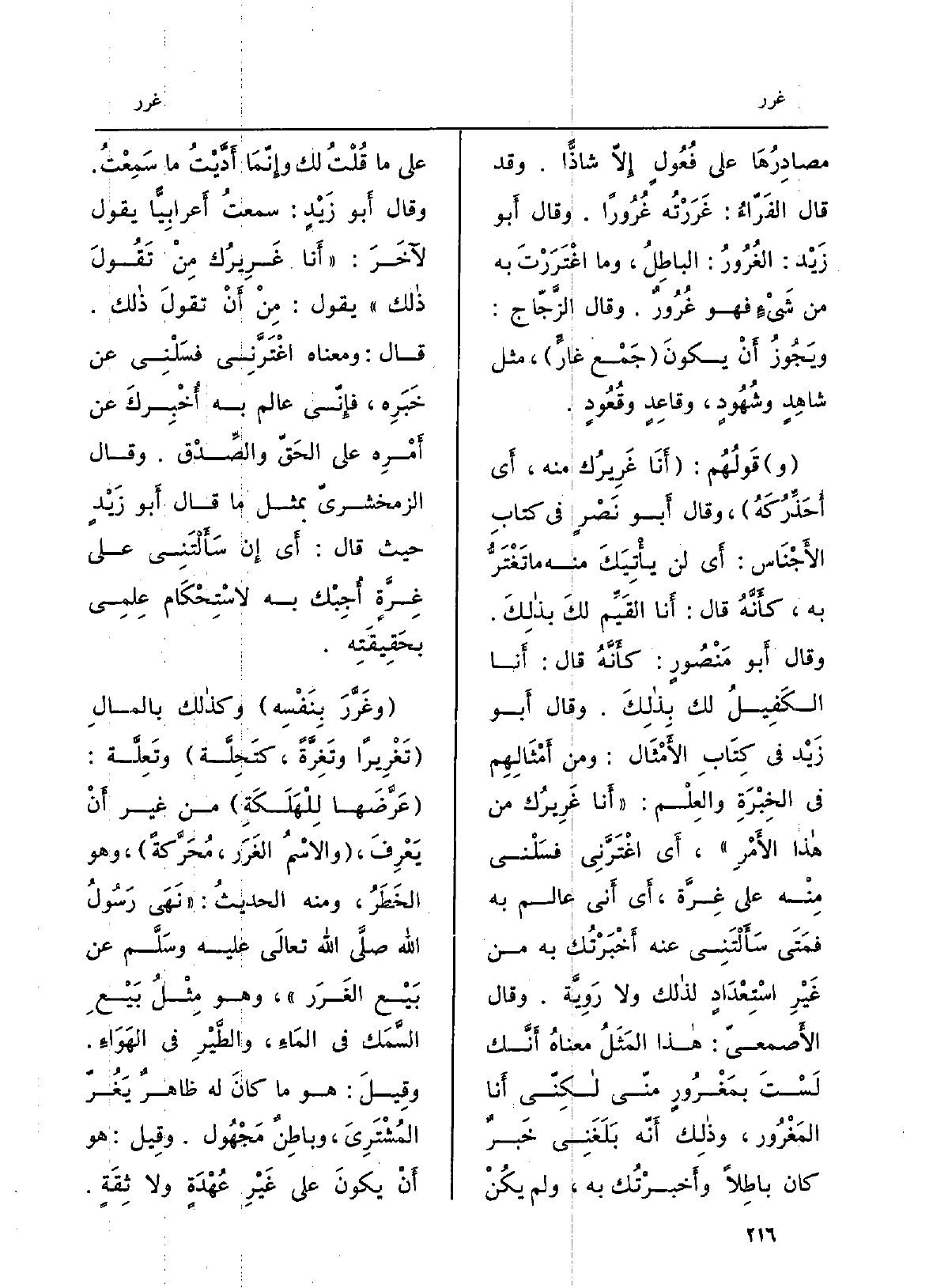 مصادِرُهَا على فُعُولٍ إِلاّ شاذّاً. وَقد قَالَ الفَرّاءُ: غَرَرْتُه غُرُوراً. وَقَالَ أَبو زَيْد: {الغُرُورُ: الباطِلُ، وَمَا} اغْتَرَرْتَ بِهِ من شَيْءٍ فَهُوَ {غُرُورٌ. وَقَالَ الزَّجّاج: ويَجُوزُ أَنْ يكونَ جَمْع} غارٍّ، مثل شاهِدٍ وشُهُودٍ، وقاعِدٍ وقُعُودٍ. وقَوْلُهُم: أَنَا {غَرِيرُك مِنْهُ، أَي أُحَذِّرُكَهُ، وَقَالَ أَبو نَصْرٍ فِي كتابِ الأَجْنَاس: أَي لن يأْتِيَكَ مِنْهُ مَا} تَغْتَرُّ بِهِ، كأَنَّهُ قَالَ: أَنا القَيِّم لكَ بذلِكَ. وَقَالَ أَبو مَنْصُورٍ: كأَنَّهُ قَالَ: أَنا الكَفِيلُ لَك بِذلِكَ. وَقَالَ أَبو زَيْد فِي كِتَابِ الأَمْثَال: وَمن أَمْثَالِهِم فِي الخِبْرَةِ والعِلْم: أَنا غَرِيرُك من هَذَا الأَمْرِ، أَي {- اغْتَرَّنِي فسَلْني مِنْه على} غِرَّة، أَي أَني عَالم بِهِ فمَتَى سَأَلْتَنِي عَنهُ أَخْبَرْتُك بِهِ من غَيْرِ اسْتِعْدَادٍ لذَلِك وَلَا رَوِيَّة. وَقَالَ الأَصمعيّ: هَذَا المَثَلُ معناهُ أَنَّك لَسْتَ {بمَغْرُورٍ منّي لكشنّي أَنا المَغُرور، وذلِك أَنّه بَلَغَنِي خَبرٌ كَانَ باطِلاً وأَخْبرْتُك بِهِ، وَلم يكُنْ على مَا قُلْتُ لَك وإِنّمَا أَدَّيْتُ مَا سَمِعْتُ. وَقَالَ أَبو زَيْدٍ: سمعتُ أَعرابِيّاً يَقُول لآخَرَ: أَنا غَرِيرُك مِنْ تَقُولَ ذَلِك يَقُول: مِنْ أَنْ تقولَ ذَلِك. قَالَ: وَمَعْنَاهُ} - اغْتَرَّنِي فسَلْنِي عَن خَبَرِه فإِنّي عَالم بِهِ أُْخِبرَك عَن أَمْرِه على الحَقّ والصِّدْقَ. وَقَالَ الزمخشريّ بِمثل مَا قَالَ أَبُو زَيْدٍ حَيْثُ قَالَ: أَي إِن سَأَلْتَنِي على {غِرَّةٍ أُجِبْك بِهِ لاسْتِحْكَام عِلمِي بحَقِيقَتِه.} وغَرَّرَ بنَفْسِه وَكَذَلِكَ بالمالِ {تَغْرِيراً} وتغِرَّةً، كتَحِلَّة وتَعِلَّة: عَرَّضَها لِلْهَلَكَةِ من غير أَنْ يَعْرِفَ، والاسْمُ! الغَرَر، مُحََّركةً، وَهُوَ الخَطرَ، ُ وَمِنْه الحديثُ: نَهَى رَسُولُ الله صلَّى الله تعالَى عَلَيْهِ وسَلَّم عَن بَيْع الغَرَر، وَهُوَ مِثْلُ بَيْعِ السَّمَك فِي المَاءِ، والطَّيْرِ فِي الهَوَاءِ. وقِيلَ: هُوَ مَا كانَ لَهُ ظاهرٌ يَغُرّ المُشْتَرِيَ، وباطِنٌ مَجْهُول. وقِيل: هُوَ أَنْ يكونَ على غَيْرِ عُهْدَةٍ وَلَا ثِقَةٍ. قَالَ الأَزهريّ: