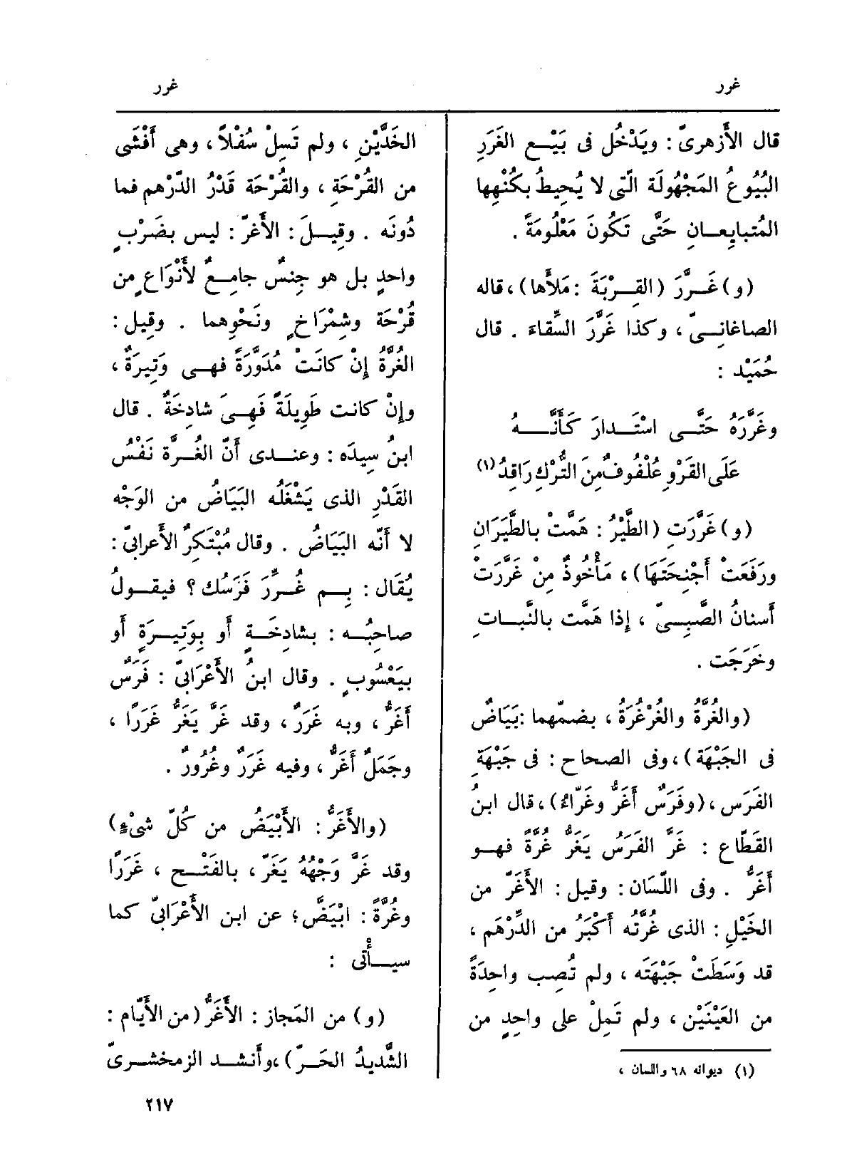 } والأَغَرُّ: الأَبْيَضُ من كُلّ شئٍ وَقد غَرَّ وَجْهُهُ {يَغَرّ، بالفَتْح، غَرَراً} وغَرةً: ابْيَضَّ إِن ابْن الأَعْرَابيّ كَمَا سيأْتي: وَمن المَجاز:! الأَغَرُّ من الأَيّام: الشَّديدُ الحَرّ، وأَنشد الزمخشريّ