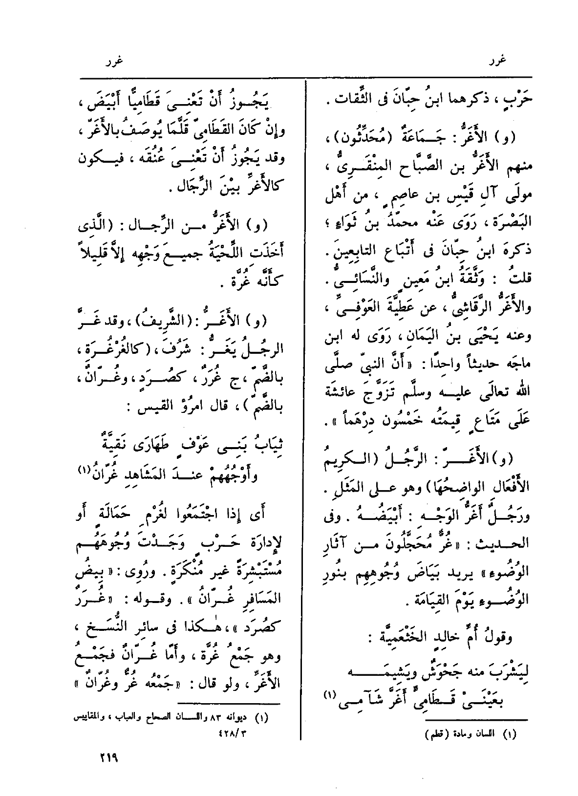 حَرْبٍ، ذكرهمَا ابنُ حِبّانَ فِي الثِّقات. والأَغَرُّ: جَمَاعَةٌ مُحَدِّثُون، مِنْهُم الأَغَرُّ بن الصَّبَّاح المِنْقَرِيُّ، مولَى آلِ قَيْسِ بن عاصِمٍ، من أَهْل البَصْرَة، رَوَى عَنْه محمّدُ بنُ ثَوَاءٍ ذكرَه ابنُ حِبّانَ فِي أَتْبَاع التابِعينَ. قلتُ:) وَثَّقَةُ ابنُ مَعِينٍ والنَّسَائِيُّ. {والأَغَرُّ الرَّقَاشِيُّ، عَن عَطِيَّةَ العَوْفِيِّ، وَعنهُ يَحْيَى بنُ اليَمَانِ، رَوَى لَهُ ابْن ماجَه حَدِيثا واحِداً: أَنَّ النبيّ صلَّى الله تعالَى عَلَيْهِ وسلَّم تَزَوَّجَ عائشَة عَلَى مَتَاعٍ قِيمَتُه خَمْسُون دِرْهَماً. والأَغَرّ: الرَّجُلُ الكرِيمُ الأَفْعَالِ الواضِحُهَا وَهُوَ على المَثَلِ. ورَجُلٌ أَغَرُّ الوَجْهِ: أَبْيَضُهُ. وَفِي الحَدِيث:} غُرٌّ مُحَجَّلُونَ من آثَارِ الوُضُوءِ يُرِيد بَيَاضَ وُجُوهِهِم بنُورِ الوُضُوءِ يَوْمَ القِيَامَة. وقولُ أُمِّ خالِدٍ الخَثْعَمِيَّة: