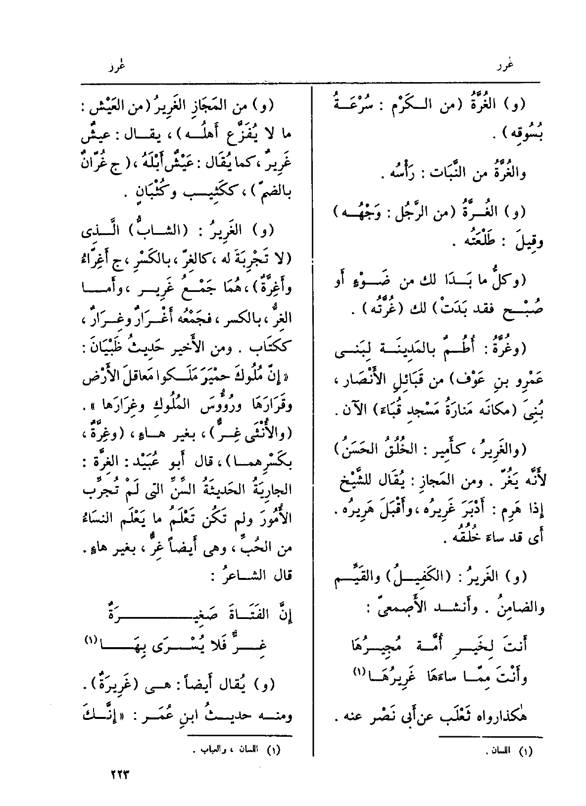والغُرَّةُ من الكَرْم: سُرْعَةُ بُسُوقِه. والغُرَّةُ من النَّبَات: رَأْسُه. والغُرَّةُ من الرَّجُل: وَجْهُه وقيِلَ: طَلْعَتُه. وكلُّ مَا بَدَا لَك من ضَوْءٍ أَو صُبْح فقد بَدَتْ لَك {غُرَّتُه.} وغُرَّةُ: أُطُمٌ بالمَدِينَة لِبَني عَمْرِو بنِ عَوْف من قَبَائِلِ الأَنْصَار، بُنِيَ مكانَه مَنارضةُ مَسْجدِ قُبَاءَ الْآن.