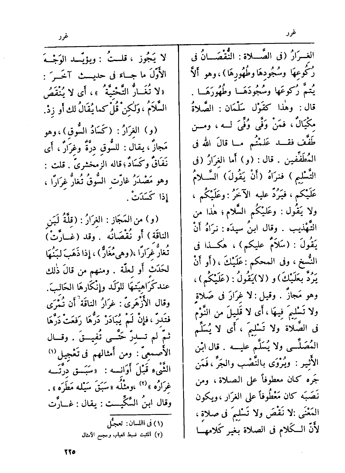 الغِرَارُ فِي الصَّلاة: النُّقْصَانُ فِي رُكُوعِهَا وسُجُودِهَا وطُهُورِهَا، وَهُوَ أَلاَّ يُتمَّ رُكوعَها وسُجُودَهَا وطُهُورَهَا. قَالَ: وَهَذَا كقَول سَلْمان: الصَّلاةُ مِكْيَالٌ، فمَنْ وَفَّى وُفِّىَ لَهُ، وَمن طَفَّف فقد عَلِمْتُم مَا قالَ الله فِي المُطَفِّفين. قَالَ: وأَما الغِرارُ فِي التَّسْلِيم فنرَاهُ أَنْ يَقُولَ السَّلامُ عَلَيْكم، فيَرُدّ عَلَيْهِ الآخَرُ: وعَلَيْكُم، وَلَا يقُول: وعَلَيْكُم السَّلام هَذَا من التَّهْذِيب. وَقَالَ ابنُ سيدَه: نرَاهُ أَنْ يَقُولَ: سَلاَمٌ عَلَيْكُم، هَكَذَا فِي النُّسخ، وَفِي الْمُحكم: عَلَيْكَ، أَوْ أَنْ يَرُدَّ بعَلَيْكَ وَلَا يَقُولُ: عَلَيْكُم، وَهُوَ مَجازٌ. وَقيل: لَا غِرَارَ فِي صَلاةٍ وَلَا تَسْلِيمَ فِيهَا، أَي لَا قَلِيلَ من النَّوْم فِي الصَّلاة وَلَا تَسْلِيمَ، أَي لَا يُسَلِّم المُصَلِّى وَلَا يُسَلَّم عَلَيْهِ. قَالَ ابْن الأَثِير: ويُرْوَى بالنَّصْب والجَرِّ، فَمَن جَره كَانَ مَعْطُوفاً على الصَّلَاة، وَمن نَصَبَه كَانَ مَعْطُوفاً على الغِرَارِ، وَيكون المَعْنَى: لَا نَقْصَ وَلَا تَسْلِيمَ فِي صلاةٍ، لأَنّ الكَلام فِي الصَّلَاة بغيرِ كَلامها لَا يَجُوز، قلتُ: ويؤيّد الوَجْهَ الأَوّلَ مَا جاءَ فِي حديثٍ آخَرَ: لَا {تُغَارُّ التَّحْتِيَّةُ، أَي لَا يُنْقَصُ السَّلاَمُ، ولَكِنْ قُلْ كَمَا يُقَالُ لَك أَو زِدْ.