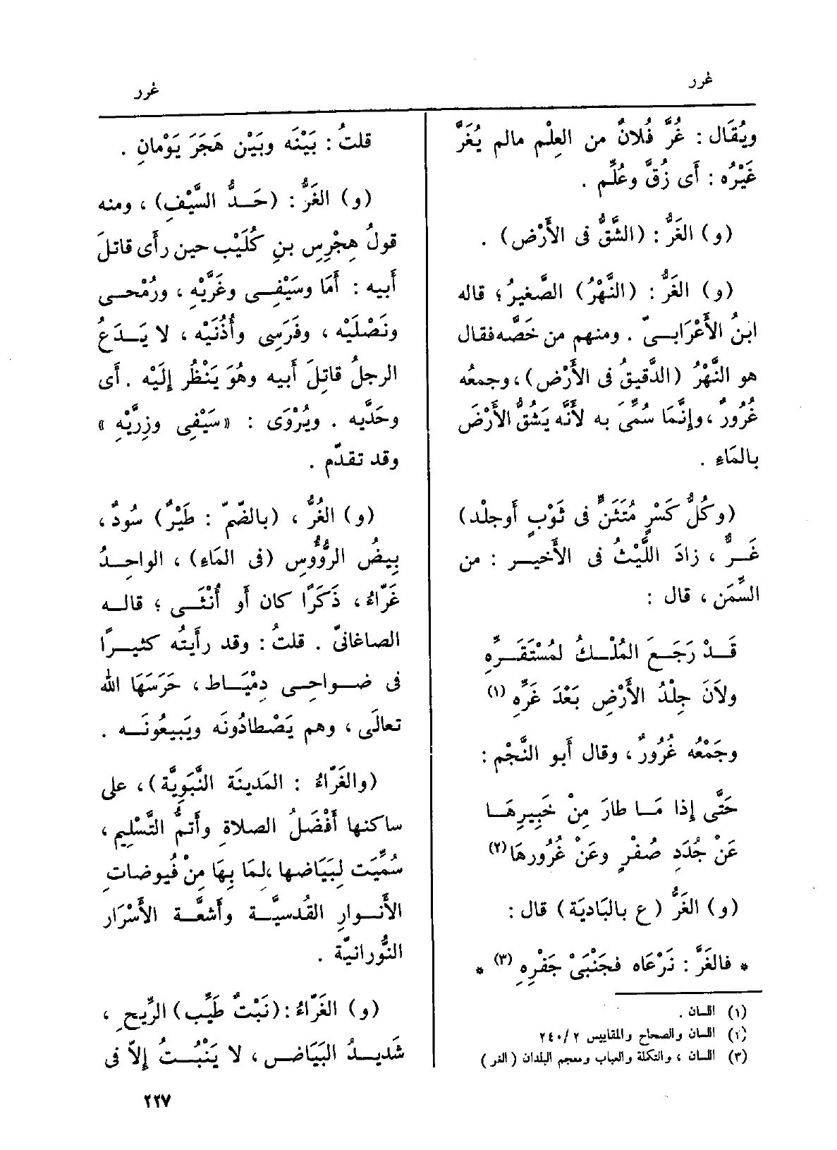 (و) } الغَرُّ ع بالبَادِيَة قَالَ: {فالغّرَّ نَرْعَاه فجَنْبَيْ جَفْرِهِ. قلتُ: بَيْنَه وبَيْن هَجَرَ يَوْمانِ. (و) } الغَرُّ: حَدُّ السَّيْفِ، وَمِنْه قولُ هِجْرِسِ بنِ كُلَيْب حِين رأى قاتلَ أَبيه: أَمَا وسَيْفِي {وغَرَّيْهِ، ورُمْحي ونَصْلَيْه، وفَرَسِي وأُذُنَيْه، لَا يَدَعُ الرجلُ قاتِلَ أَبيه وهُوَ يَنْظُر إِلَيْه. أَي وحَدَّيه. ويُرْوُى: سَيْفِي وزِرَّيْهِ وَقد تقدّم. والغُرُّ، بالضّمّ: طَيْرٌ سُودٌ بِيضُ الرُّؤُوسِ فِي المَاءِ، الواحِدُ} غَرّاءُ، ذَكَراً كَانَ أَو أُنْثَى قَالَه الصاغانيّ. قلتُ: وَقد رأَيتُه كثيرا فِي ضواحِي دِمْيَاط، حَرَسَهَا الله تعالَى، وهم يَصْطادُونَه ويَبيعُونَه.! والغَرّاُء: المَدينَة النَّبَوِيَّة، على ساكنها أَفْضَلُ الصلاةِ وأَتَمُّ التَّسْلِيم، سُمِّيَت لِبَيَاضها، لِمَا بِهَا مِنْ فُيوضاتِ الأَنوارِ القُدسيَّة وأَشعَّة الأَسْرَار النُّورانيّة. والغَرّاءُ: نَبْتٌ طَيِّب الرِّيحِ، شَديدُ البَيَاض، لَا يَنْبُتُ إِلاّ فِي