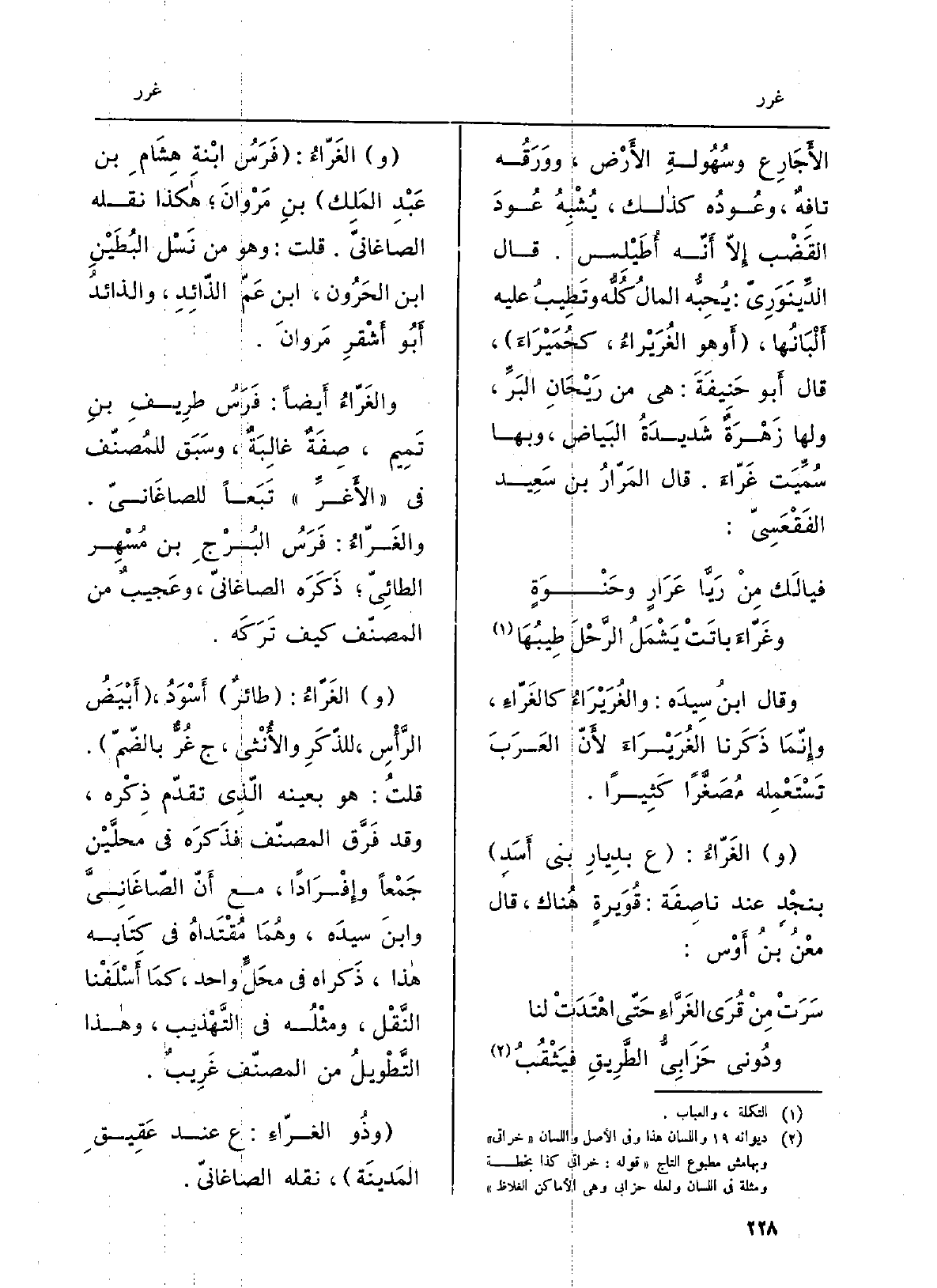 والغَرّاءُ: فَرَسُ ابْنةِ هِشَام بن عَبْدِ المَلِك بنِ مَرْوانَ هَكَذَا نَقله الصاغانيّ. قلت: وَهُوَ من نَسْل البُطَيْنِ ابْن الحَرُون، ابْن عَمّ الذّائِدِ، والذائدُ أَبُو أَشْقرِ مَروانَ. {والغَرّاءُ أَيضاً: فَرَسُ طرِيفِ بنِ تَمِيم، صِفَةٌ غالِبَةٌ، وسَبَق للمُصَنّفَ فِي الأَغَرِّ تَبَعاً للصاغَانِيّ. والغَرّاءُ: فَرَسُ البُرْجِ بن مُسْهِر الطائِيّ ذَكَرَه الصاغانيّ، وعَجيبٌ من المصنّف كَيفَ تَرَكَه. والغَرّاءُ: طائرٌ أَسْوَدُ، أَبْيَضُ الرَأْسِ، للذّكَرِ والأُنْثى، ج} غُرٌّ بالضّمّ. قلتُ: هُوَ بِعَيْنِه الّذِي تقدّم ذِكْره، وَقد فَرَّق المصنّف فذَكَرَه فِي محلَّيْن جَمْعاً وإِفْرَاداً، مَعَ أَنّ الصّاغَانِيَّ وابنَ سِيدَه، وهُمَا مُقْتَداهُ فِي كِتَابه هَذَا، ذكَراه فِي محَلٍّ وَاحِد، كمَا أَسْلَفْنا النَّقْل، ومثْلُه فِي التَّهْذيب، وَهَذَا التَّطْويلُ من المصنّف غَرِيبٌ. وذُو الغَرّاءِ: ع عِنْد عَقِيقِ المَدينَة، نَقله الصاغانيّ.