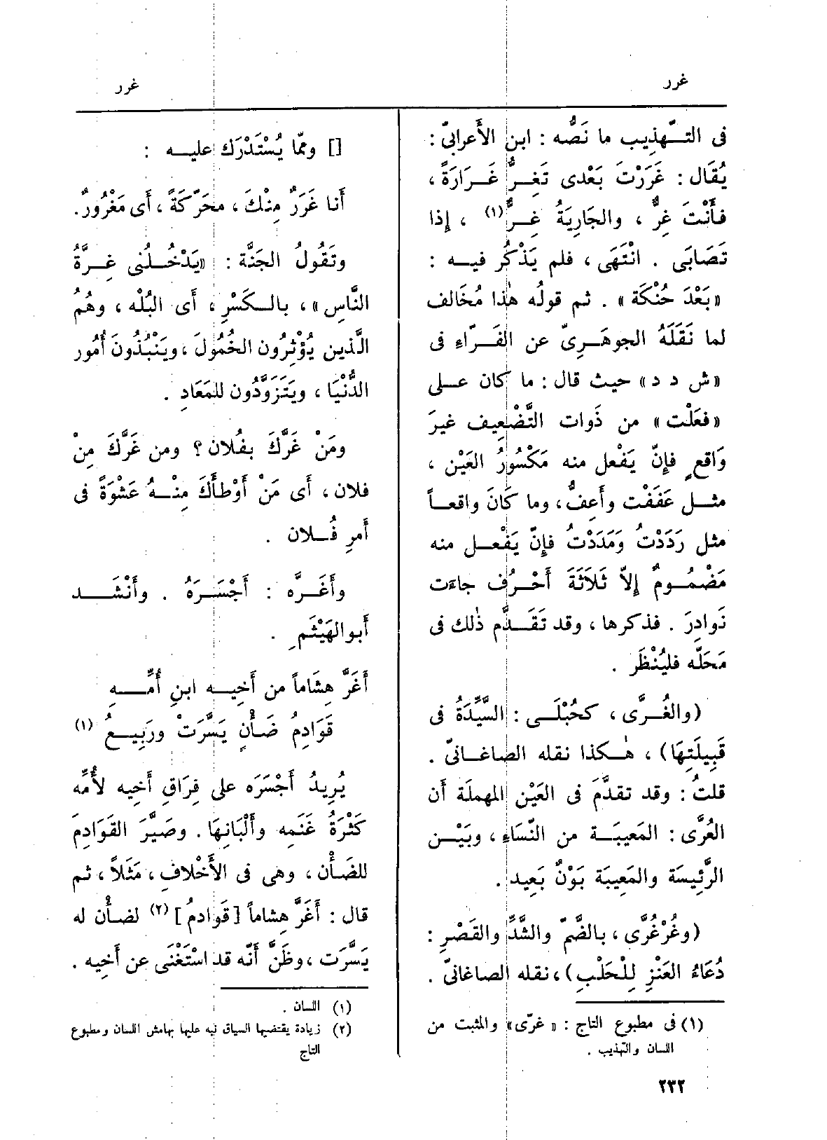 فِي التّهذيِب مَا نَصُّه: ابْن الأَعرابيّ: يُقَال: {غَرَرْتَ بَعْدي} تَغِرُّ {غَرَارَةً، فأَنْتَ} غِرٌّ، والجَارِيَةُ غِرٌّ، إِذا تَصَابىَ. انْتَهَى، فَلم يَذْكُر فِيهِ: بَعْدَ حُنْكَة. ثمَّ قولُه هَذَا مُخَالف لما نَقَلَهُ الجوهَرِيّ عَن الفَرّاءِ فِي ش د د حَيْثُ قَالَ: مَا كَانَ على فَعَلْت من ذَوات التَّضْعِيف غيرَ وَاقعٍ فإِنّ يَفْعل مِنْهُ مَكْسُورُ العَيْن، مثل عَفَفْت وأَعِفُّ، وَمَا كَانَ وَاقعا مثل رَدَدْتُ ومَدَدْتُ فإِنّ يَفْعل مِنْهُ مَضْمُومٌ إِلاّ ثَلاَثَةَ أَحْرُف جاءَت نَوادِرَ. فَذكرهَا، وَقد تَقَدَّم ذَلِك فِي مَحَلّه فليُنْظَر. {والغُرَّى، كحُبْلَى: السَّيِّدَةُ فِي قَبِيلَتِهَا، هَكَذَا نَقله الصاغانيّ. قلتُ: وَقد تقدَّمَ فِي العَيْن المهملَة أَن العُرَّى: المَعيبَة من النّسَاءِ، وبَيْن الرَّئِيسَة والمَعِيبَة بَوْنٌ بَعِيد.} وغُرْغُرَّى، بالضَّمّ والشَّدِّ والقَصْرِ: دُعَاءُ العَنْزِ لِلْحَلْبِ، نَقله الصاغانيّ. وممّا يُسْتَدْرَك عَلَيْهِ: أَنا {غَرَرٌ مِنْكَ، محَرّكَةً، أَي} مَغْرُورٌ. وتَقُولُ الجَنَّة: يَدْخُلُنِي {غِرَّةُ النَّاسِ، بالكَسْرِ، أَي البُلْه، وهُمُ الَّذين يُؤْثِرُون الخُمُولَ، ويَنْبُذُونَ أُمُور الدُّنْيَا، ويَتَزَوَّدُون للمَعَادِ. ومَنْ غَرَّكَ بفُلان وَمن} غَرَّكَ مِنْ فلَان، أَي مَنْ أَوْطأَكَ مِنْهُ عَشْوَةً فِي أَمْرِ فُلان. {وأَغَرَّه: أَجْسَرَهُ. وأَنْشَد أَبو الهَيْثَمِ.)