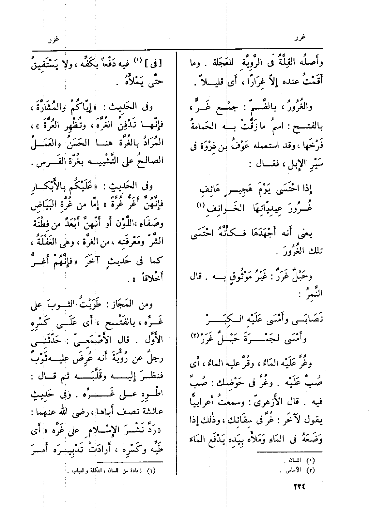 وتُظْهِر العُرَّةَ، المُرَادُ {بالغُرَّة هُنَا الحَسَنُ والعَمَلُ الصالحُ على التَّشْبيه بغُرّة الفَرس. وَفِي الحَدِيثِ: عَلَيْكُم بالأَبْكارِ فإِنَّهُنَّ} أَغَرُّ {غُرَّةً إِمّا من غُرَّةِ البَيَاضِ وصَفَاءِ، اللَّوْن أَو أَنّهنَّ أَبْعَدُ من فِطْنَة الشَّرّ ومَعْرِفَتِه، من الغرَّة، وَهِي الغَفْلَةُ، كَمَا فِي حَديثٍ آخَرَ فإِنَّهُمْ أَغرُّ أَخْلاقاً. وَمن المَجَاز: طَوَيْتُ الثوبَ على غَرِّه، بالفَتْح، أَي عَلَى كَسْرِهِ الأَوَّل. قَالَ الأَصْمَعِيّ: حَدّثَنِي رجلٌ عَن رُؤْبَةَ أَنه عُرِضَ عَلَيْهِ ثَوْبٌ فنظرَ إِليه وقَلَّبَه ثمَّ قَالَ: اطْوِهِ على غَرِّه. وَفِي حَدِيثِ عَائِشَة تصف أَباها، رَضِي الله عَنْهُمَا: رَدَّ نَشْرَ الإِسْلامِ على} غَرِّه أَي طَيِّه وكَسْرِه، أَرادَتْ تَدْبِيرَه أَمرَ